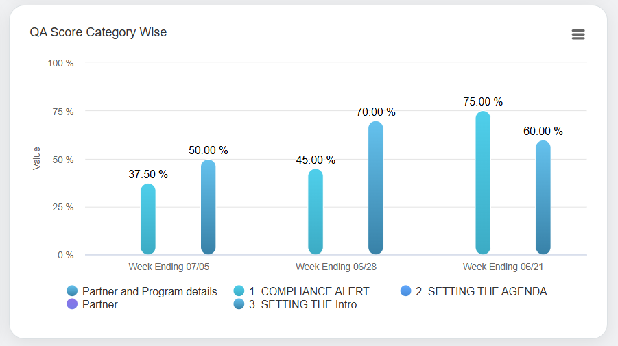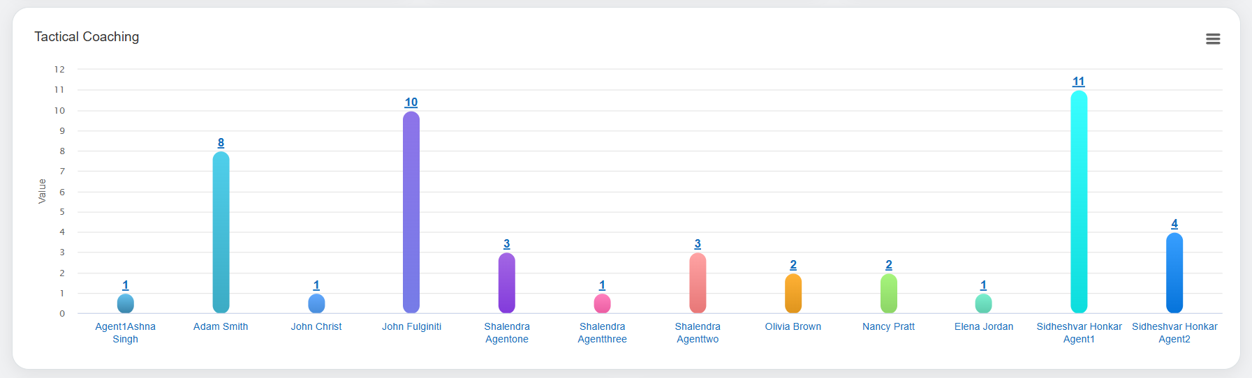 Tactical coaching graphs assist the logged-in user to access the comprehensive agent-level coaching data. These statistics are displayed in the Bar Chart format as shown below:
