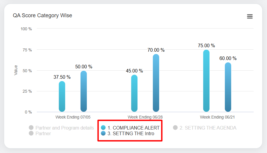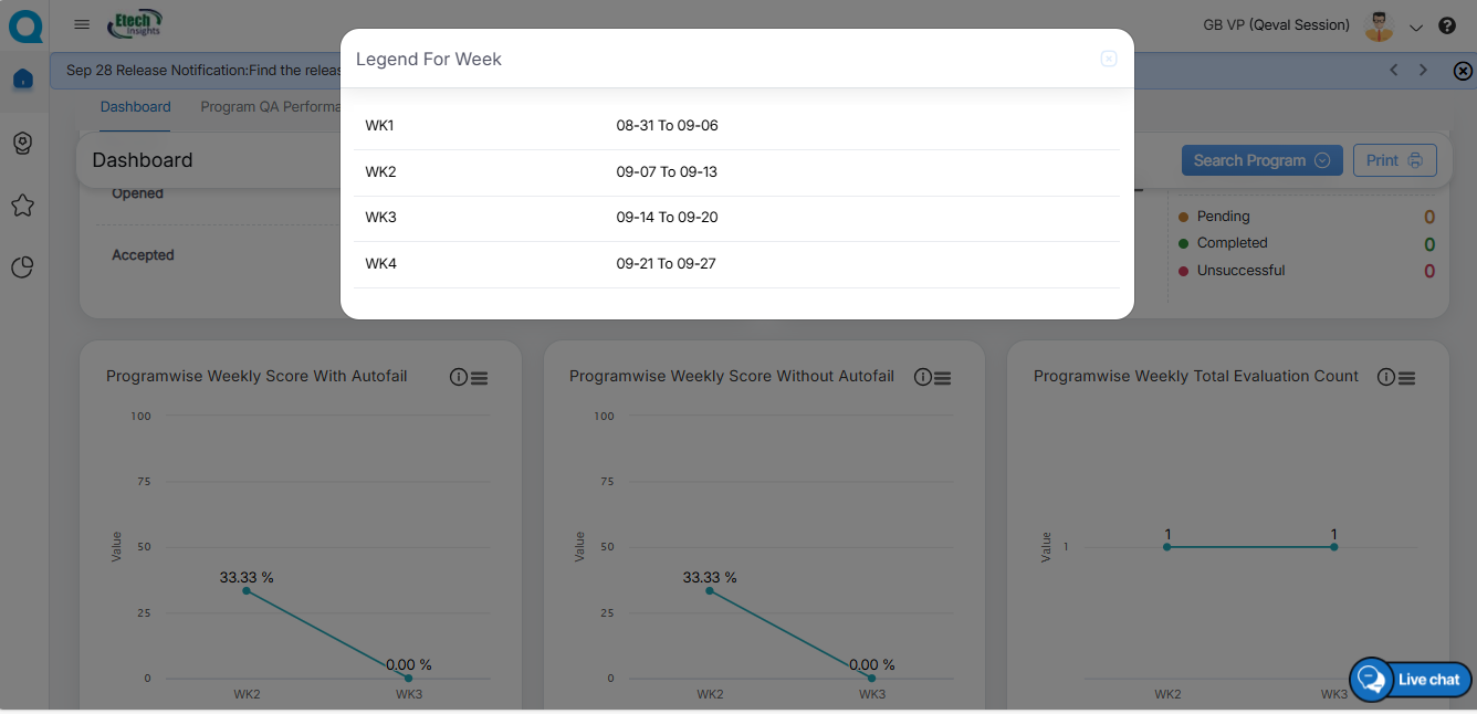 Similarly, VP can view the chart of the Weekly Score without Autofail for specific programs. To view the legends, click on the Legend For Week as shown below.