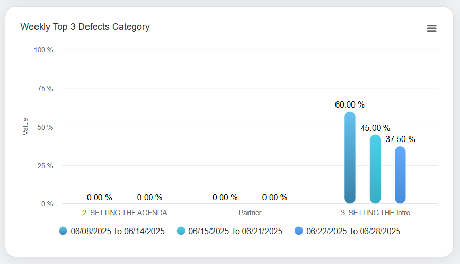 On the Overall QA Score page, the VP will be able to view the data of the QA scores – Week Wise, Center Wise, Category Wise, and Weekly Top 3 Defects Category.