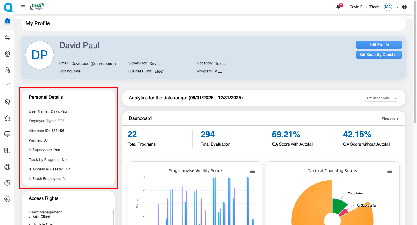 | QA Supervisor | Evaluation summaries, Live Dashboard, User Dashboard, Dispute Evaluation metrics | Update personal information (role-dependent) | Personal Information, Access Rights, Evaluation Summary Cards, Dispute-related dashboards, Program Performance Charts | Navigate to detailed dashboards via “View More” |