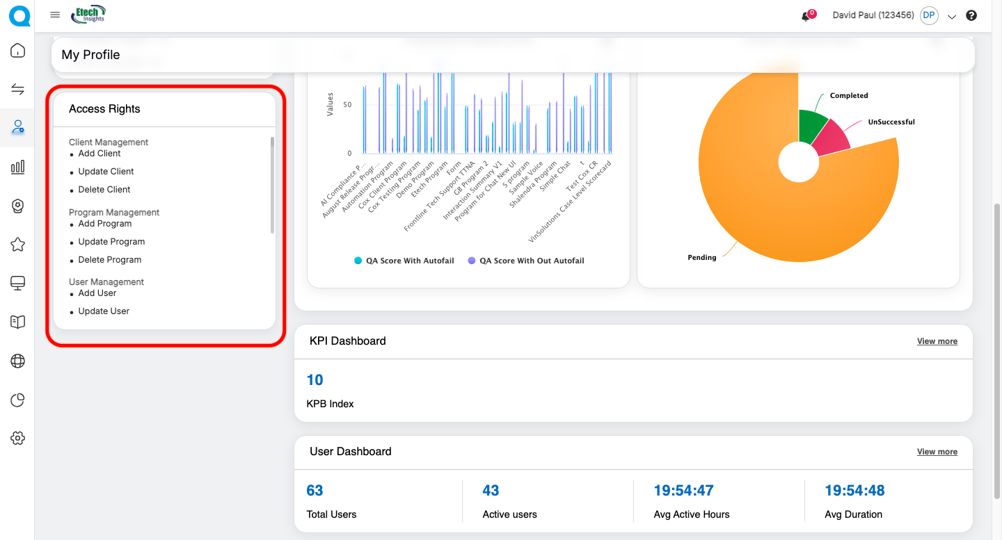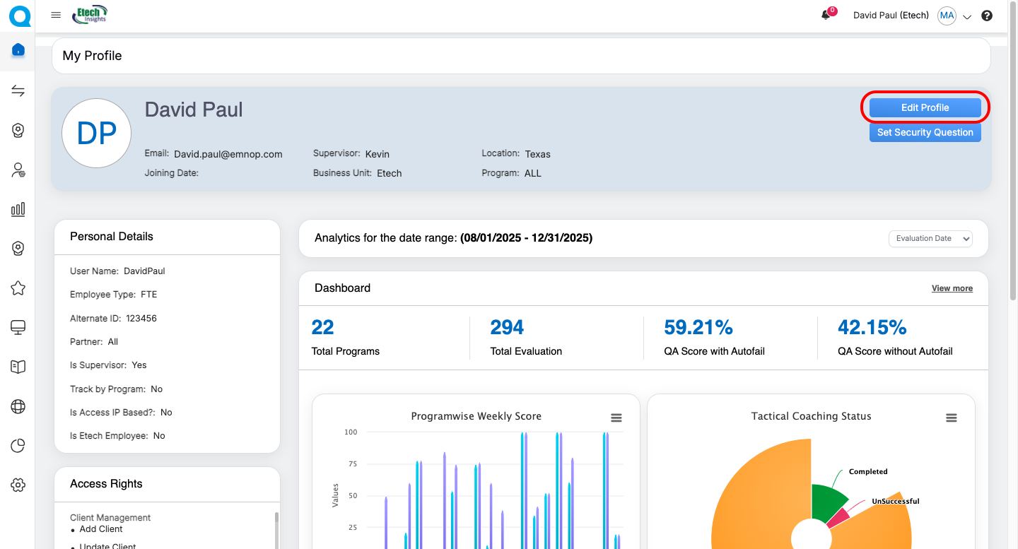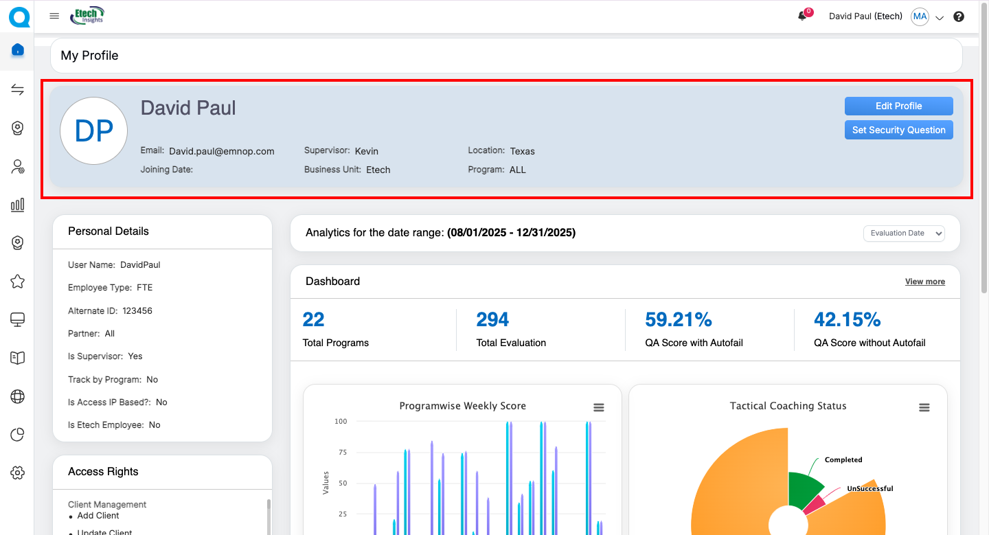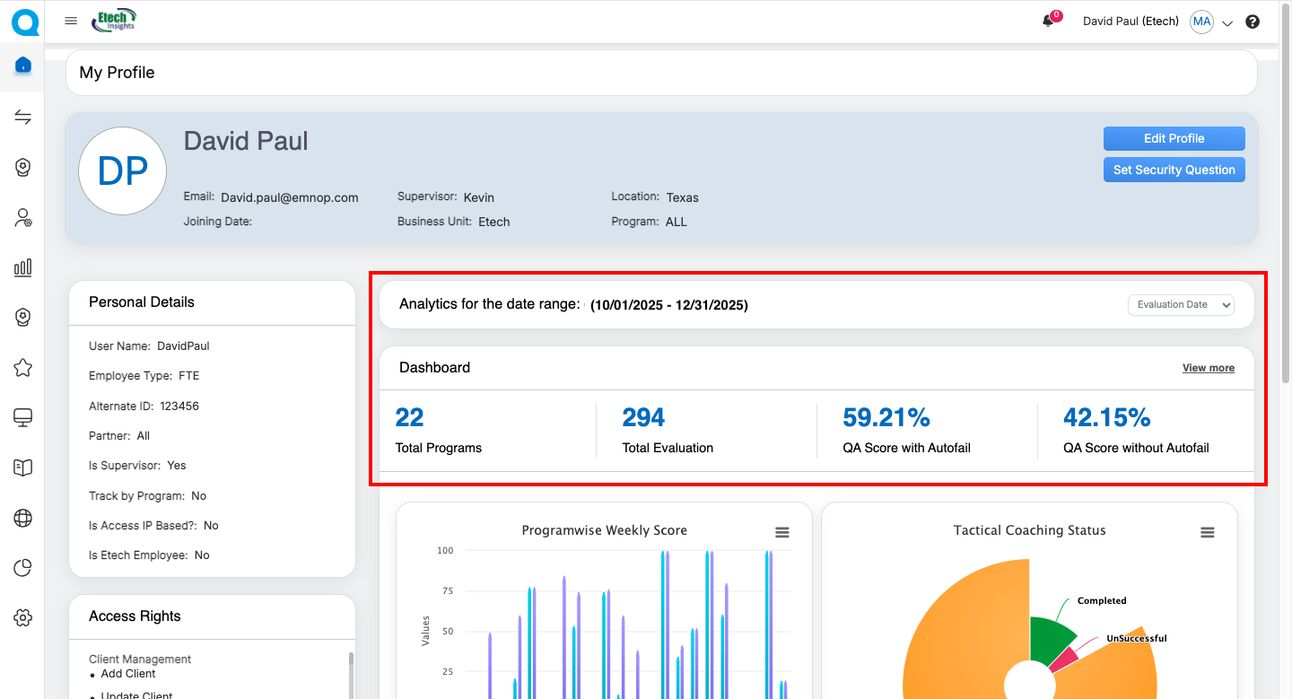 | QA Supervisor | Evaluation summaries, Live Dashboard, User Dashboard, Dispute Evaluation metrics | Update personal information (role-dependent) | Personal Information, Access Rights, Evaluation Summary Cards, Dispute-related dashboards, Program Performance Charts | Navigate to detailed dashboards via “View More” |