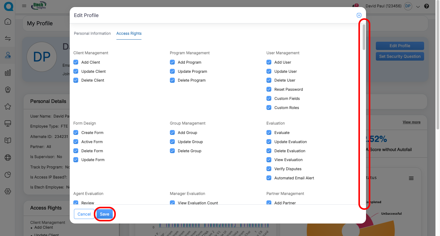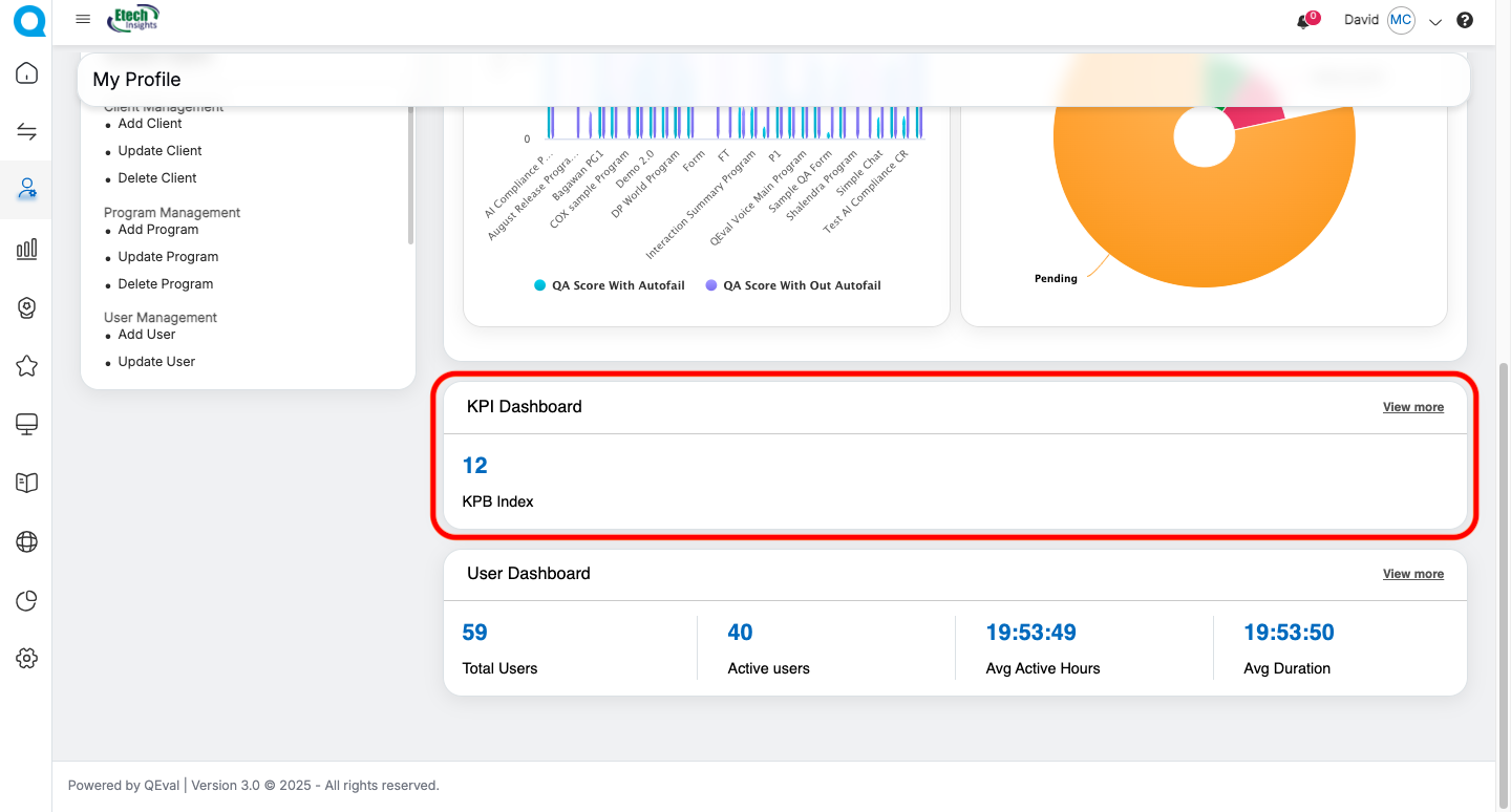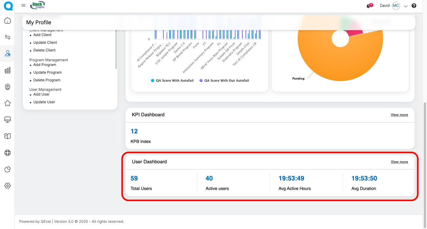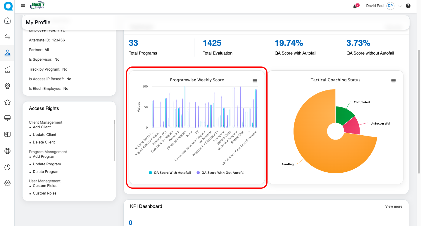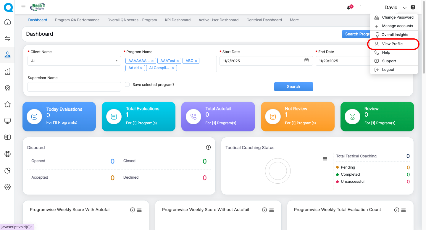 | QA Supervisor | Evaluation summaries, Live Dashboard, User Dashboard, Dispute Evaluation metrics | Update personal information (role-dependent) | Personal Information, Access Rights, Evaluation Summary Cards, Dispute-related dashboards, Program Performance Charts | Navigate to detailed dashboards via “View More” |