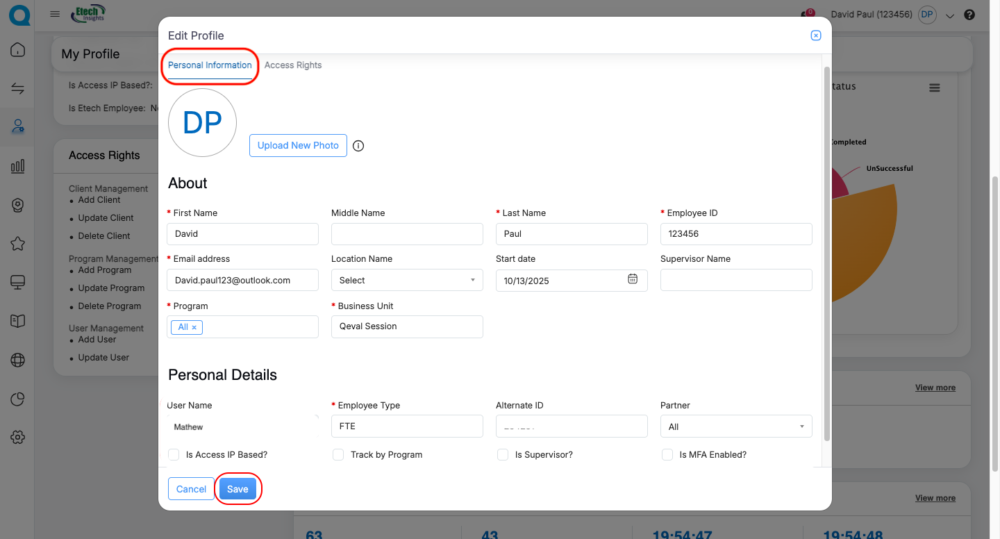 The View Profile section in the QEval Portal provides users with a centralized overview of their personal, organizational, and access-related information. While all users can view this data, editing privileges are strictly controlled through role-based permissions to maintain accuracy and security.