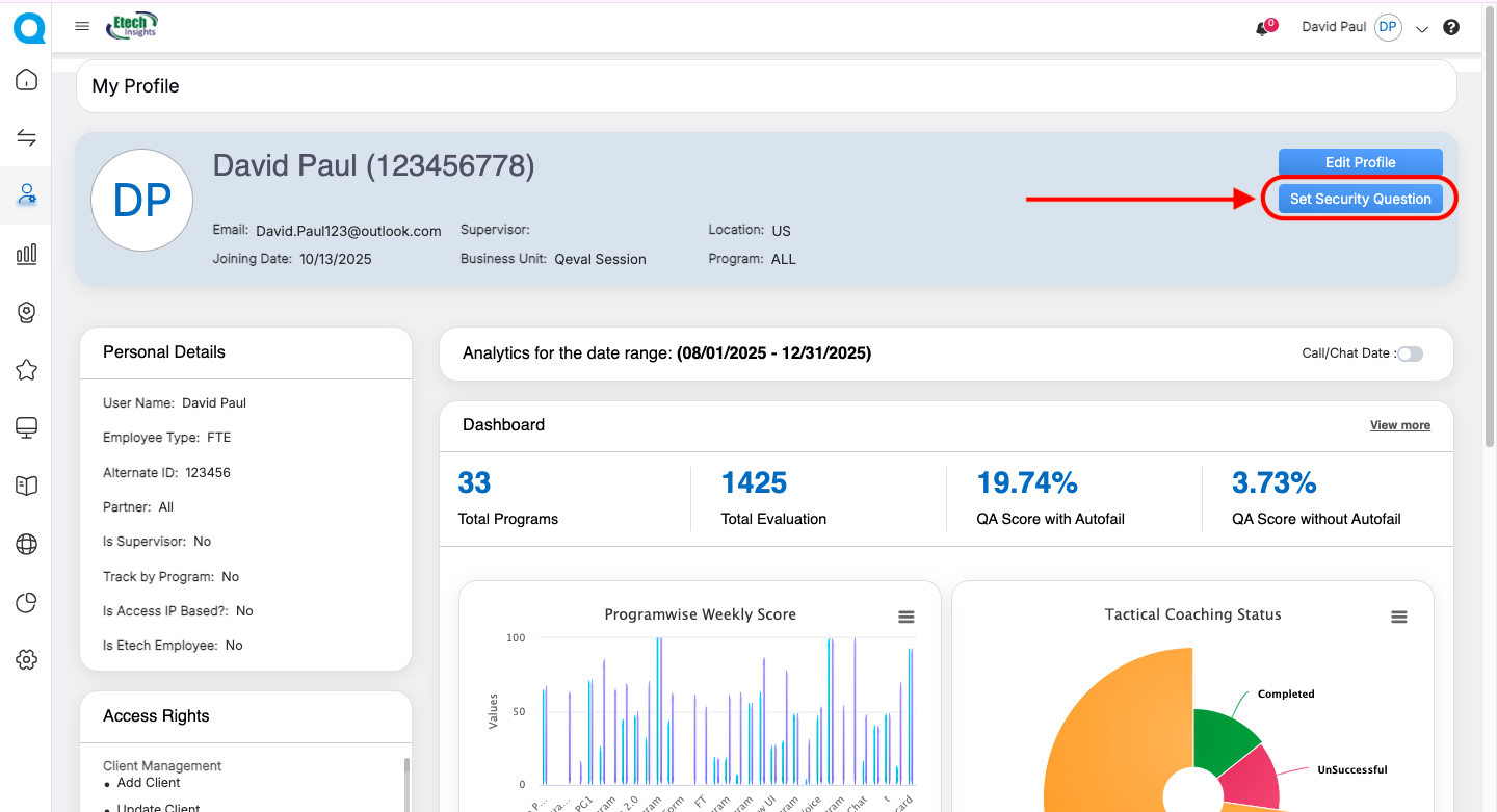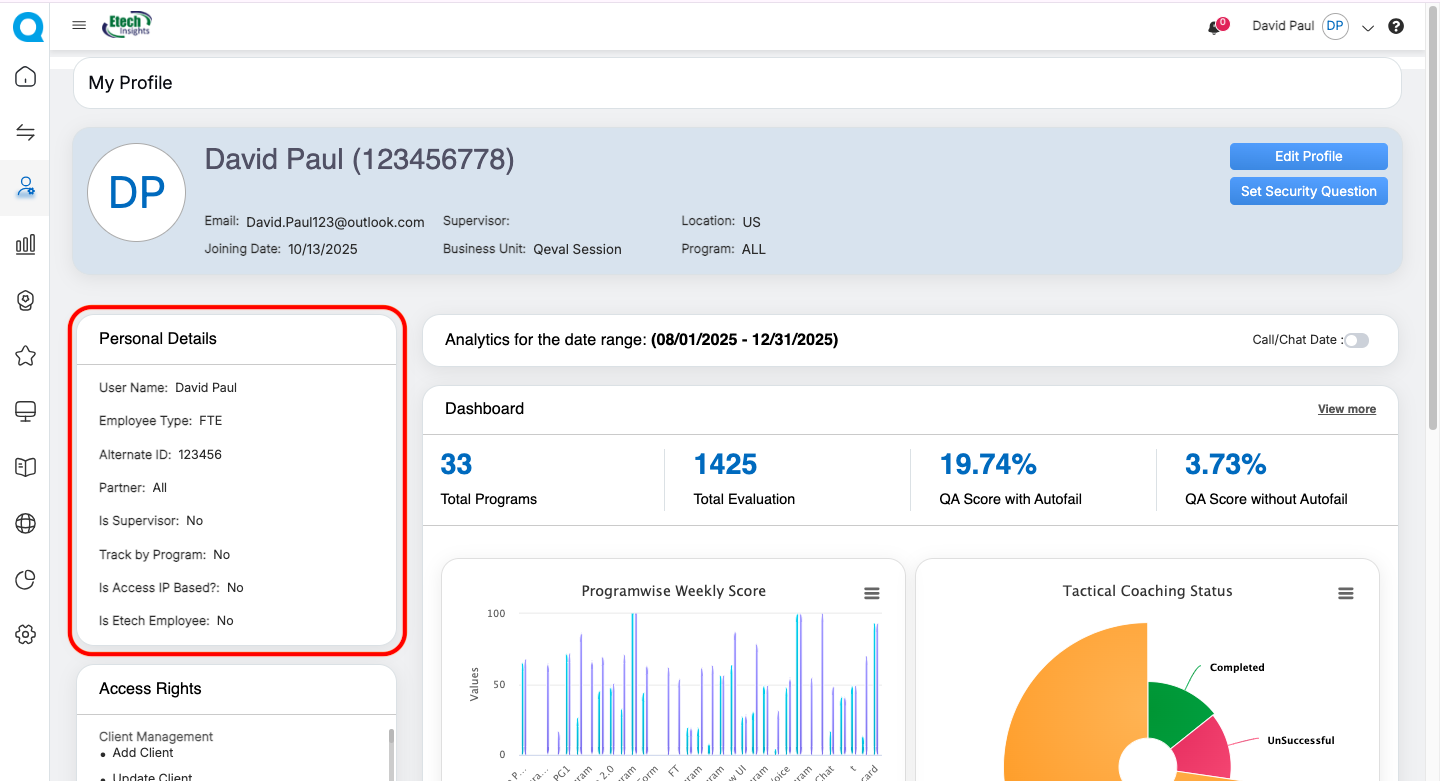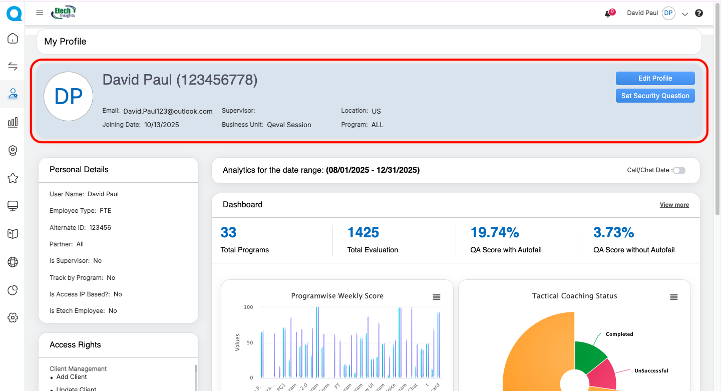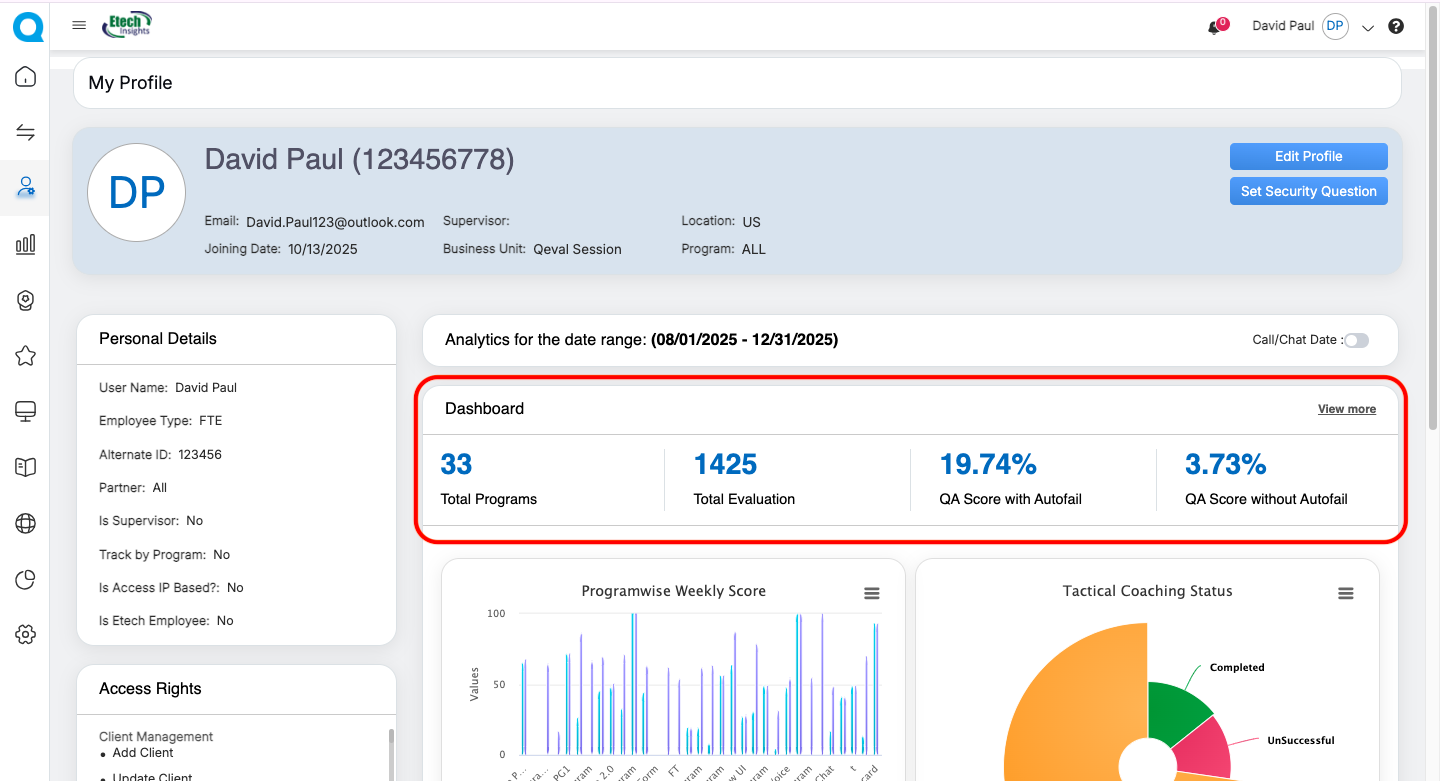 | Agent | Personal details (view-only), User Information Header, Monthly QA Trend Chart | Update profile picture, Set/Update Security Question | Personal Information Card, Access Rights Card, Dashboard Metrics, Program Weekly Score (Bar Graph), Tactical Coaching Status (Donut Chart), KPI Dashboard Card, User Dashboard Card | “View More” to access detailed dashboards |