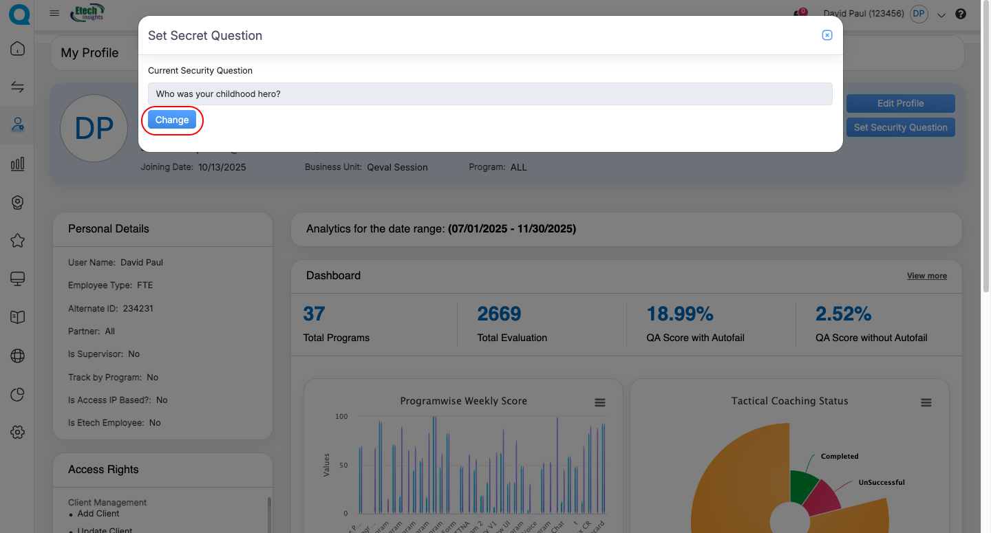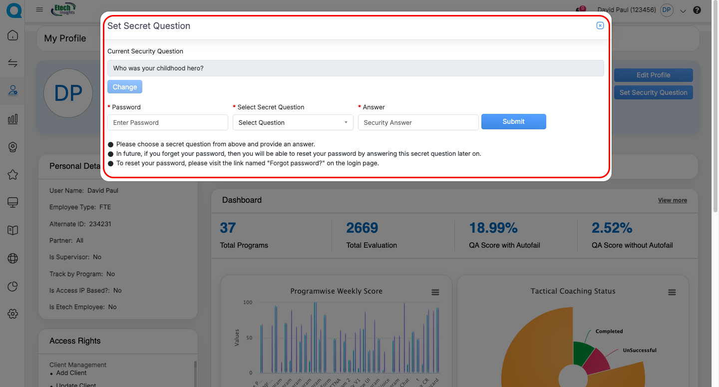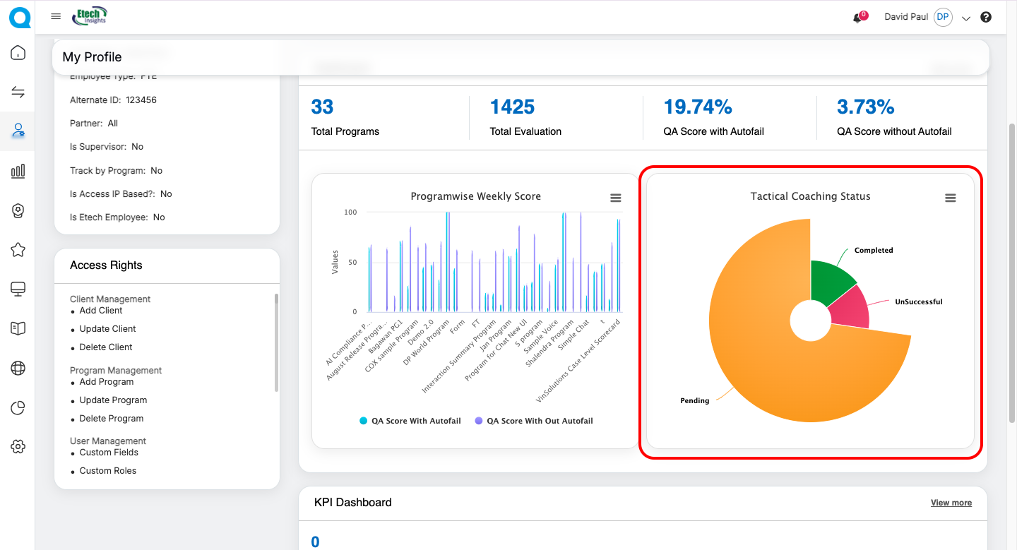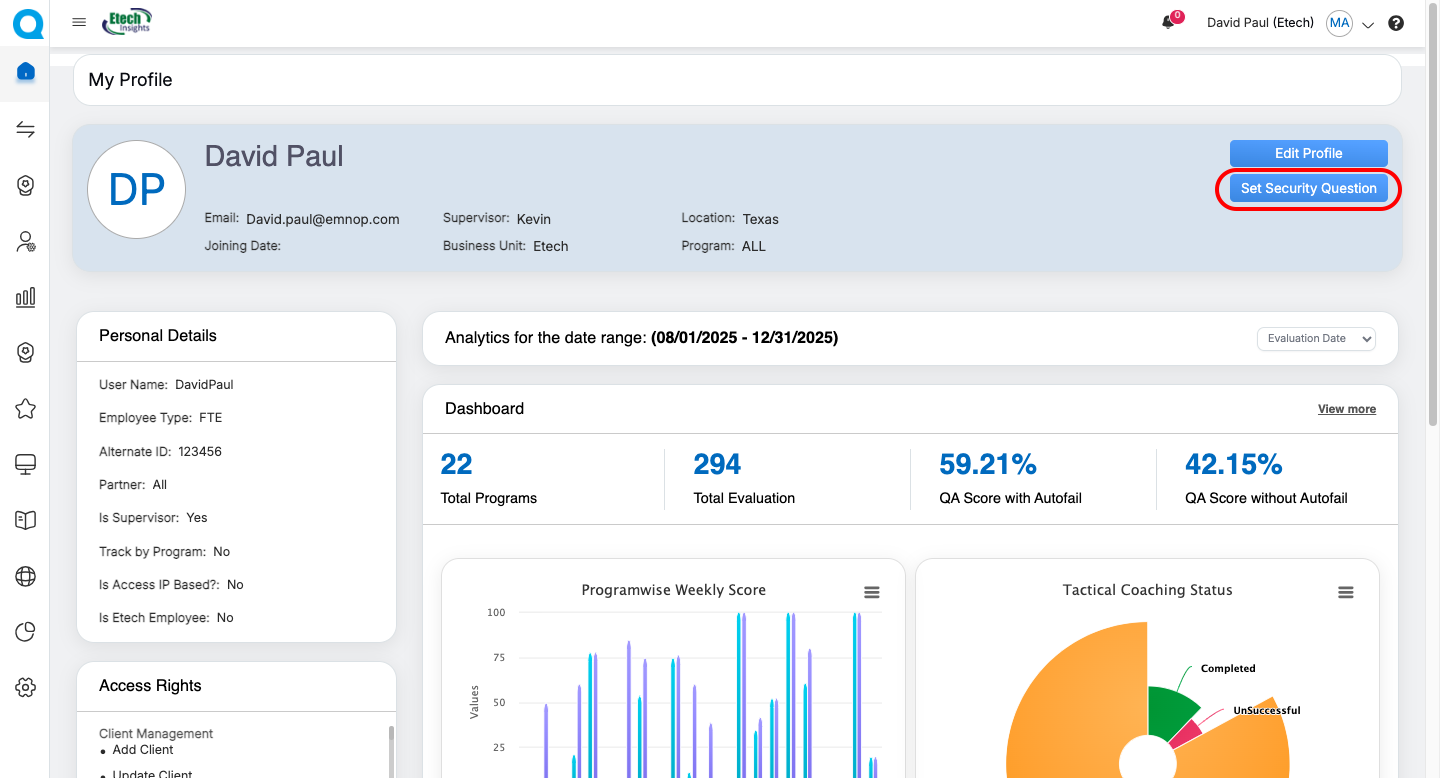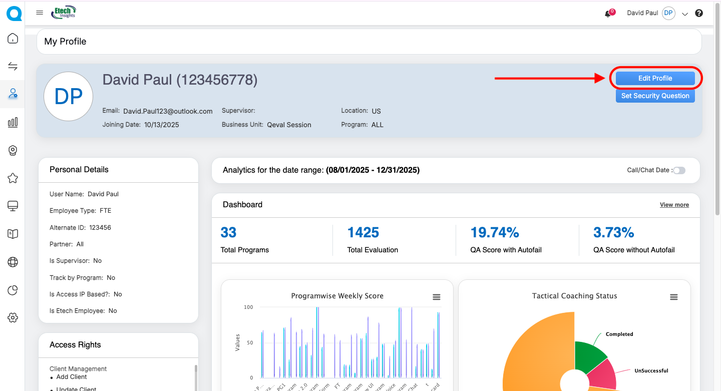 | Agent | Personal details (view-only), User Information Header, Monthly QA Trend Chart | Update profile picture, Set/Update Security Question | Personal Information Card, Access Rights Card, Dashboard Metrics, Program Weekly Score (Bar Graph), Tactical Coaching Status (Donut Chart), KPI Dashboard Card, User Dashboard Card | “View More” to access detailed dashboards |