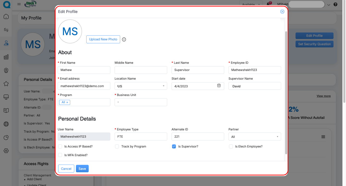 | Supervisor | Full personal details, Assigned roles (view-only), QA & Coaching trends, Agent-wise coaching summary, Drill-down charts | Update profile picture, Edit limited personal fields (if permission), Set/Update Security Question | All Agent cards plus Coaching Dashboard insights, Drilldown views for evaluations & performance | Navigate to detailed dashboards via “View More” |
