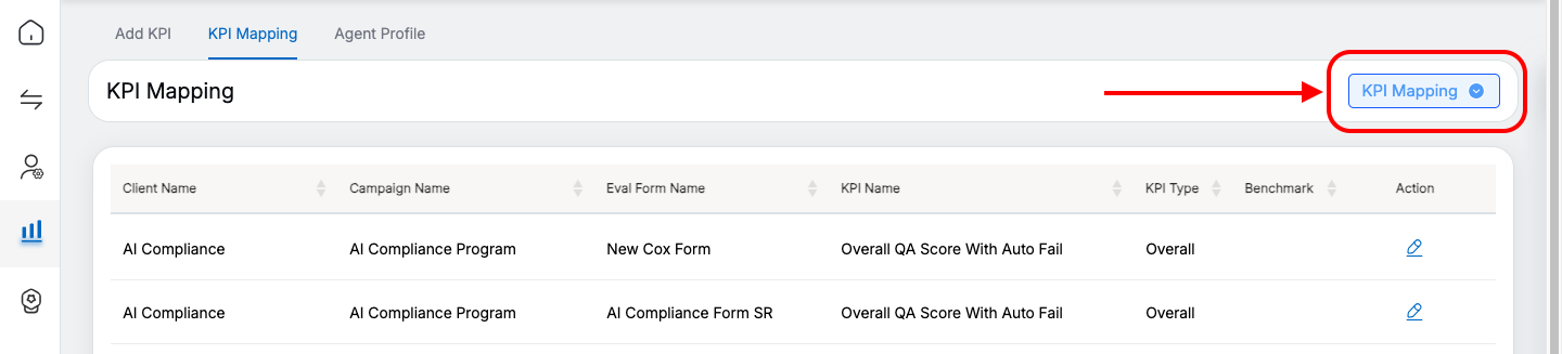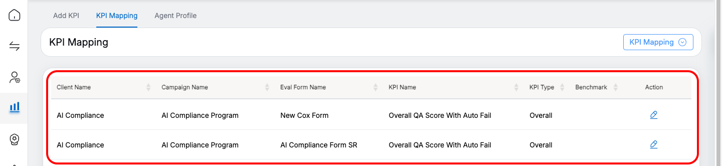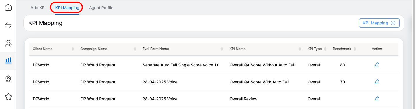 The KPI Mapping page will be displayed. On this page, the list of KPIs added for different clients will be displayed.