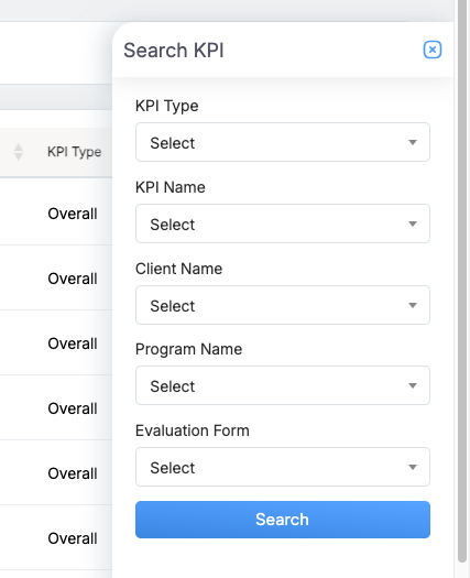 The page displays search criteria based on which one can search for a particular KPI. A KPI can be searched on the basis of the following criteria: