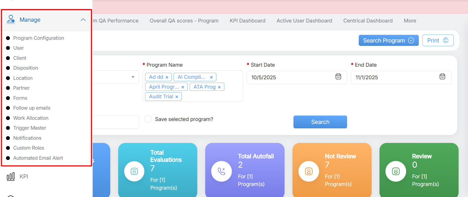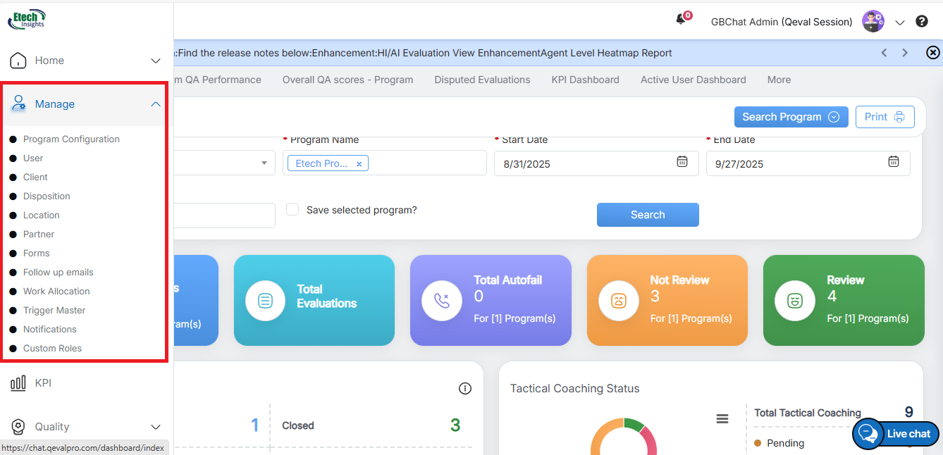 The Manage menu is mainly provided in an admin console of the QEval tool. It allows an admin to perform add, edit and search operations for various categories in the system.