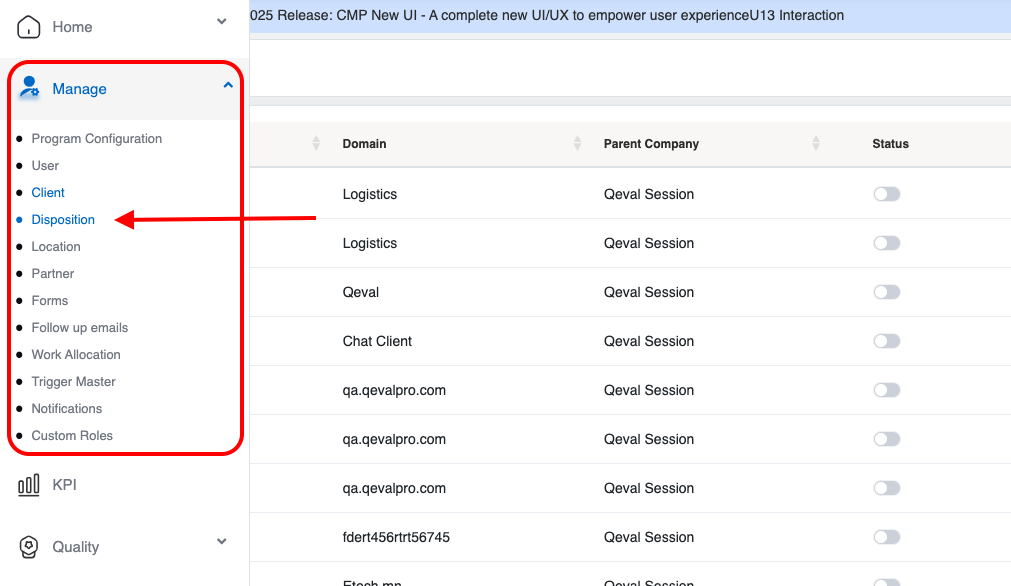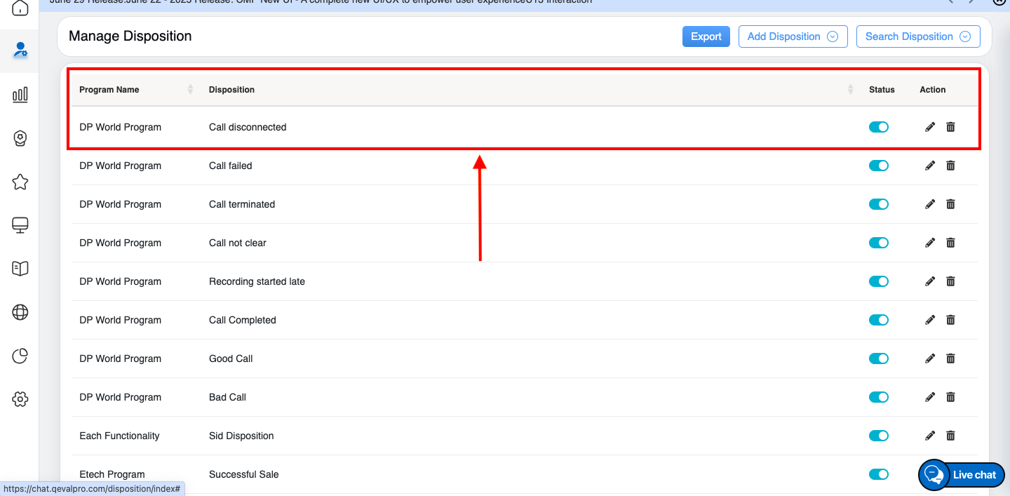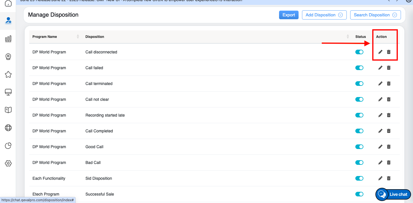 On the Manage Disposition page, the authorized user can delete the disposition details from the QEval system.