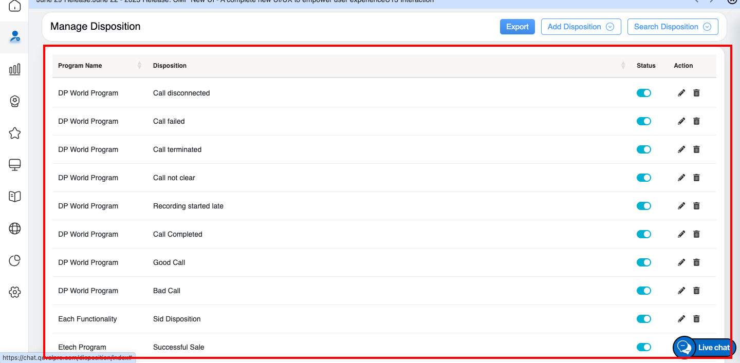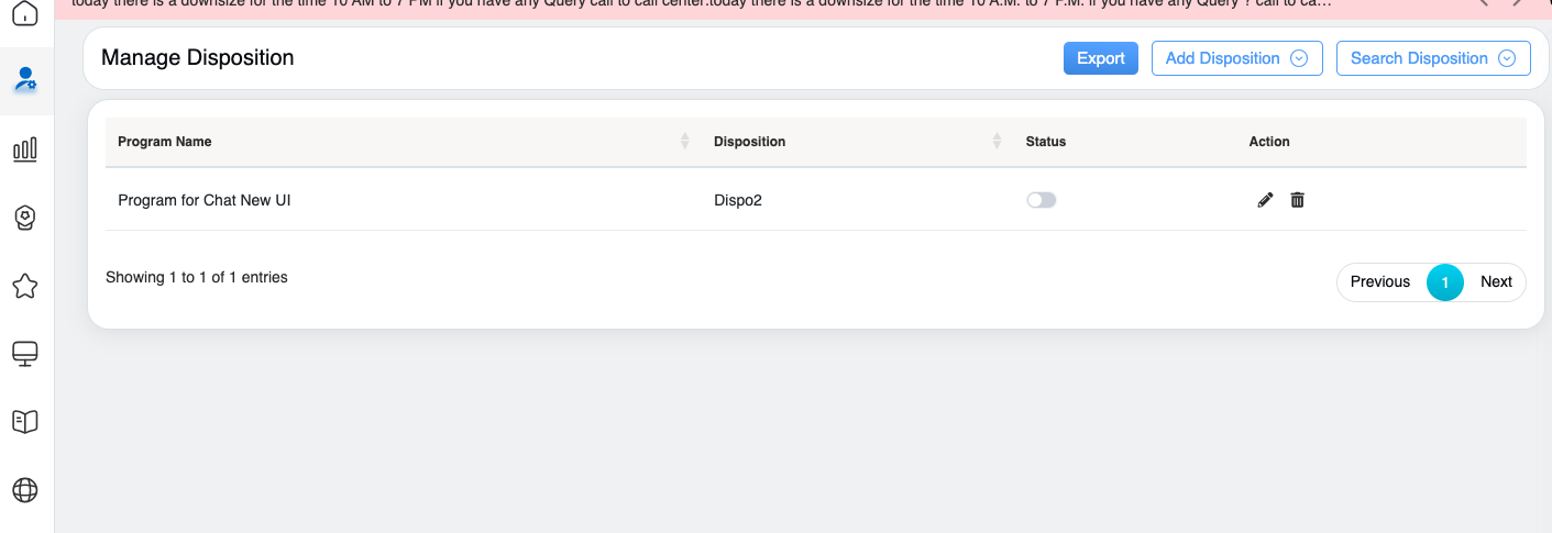 The user will be directed to the Manage Disposition page. This page displays the list of all added active disposition details as shown below: