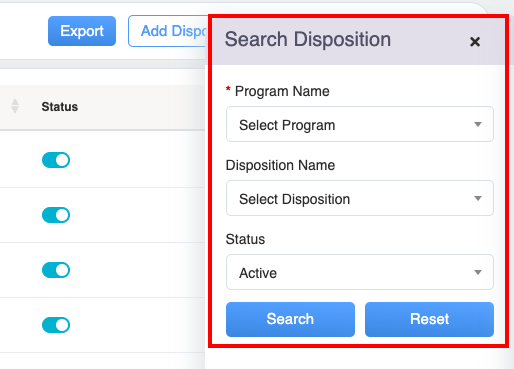 A search disposition functionality helps an admin to search active or inactive dispositions.