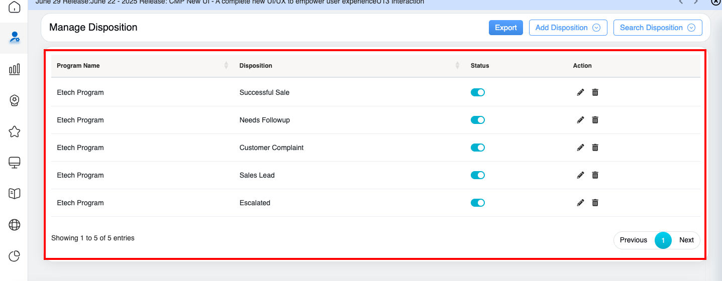 On the Manage Disposition page, the logged-in user will be able to access the mentioned below functionalities:
