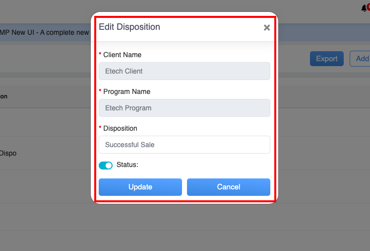 To change the status of the specific disposition from Active to Inactive or vice-versa by clicking on the Status toggle button. Once the necessary modifications are done for specific disposition, click on the Update button to save the changes, or click on the Cancel button to discard the changes.
