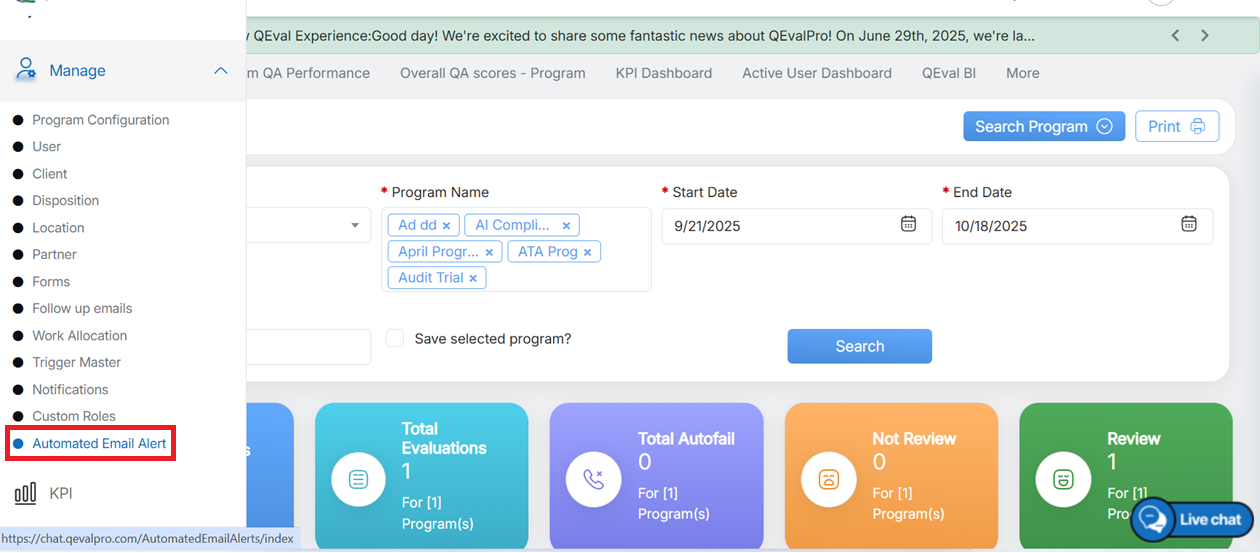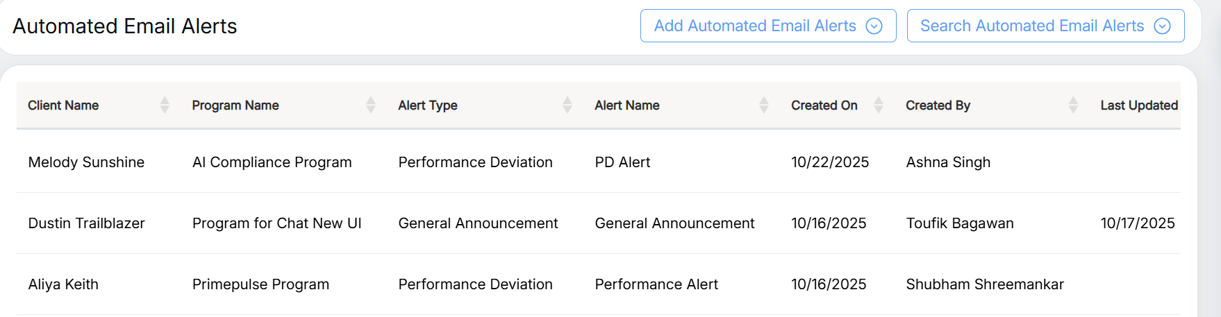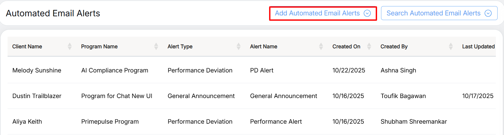 This feature enables users to configure and manage automated email alerts based on defined triggers such as Auto fail score, performance deviation, or General announcements. This helps in increased system adoption, streamlined alert configurations and quicker updates.