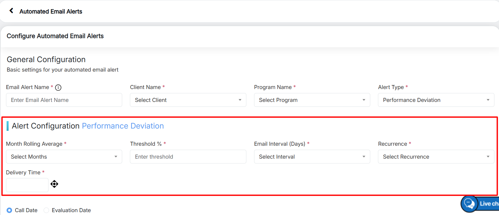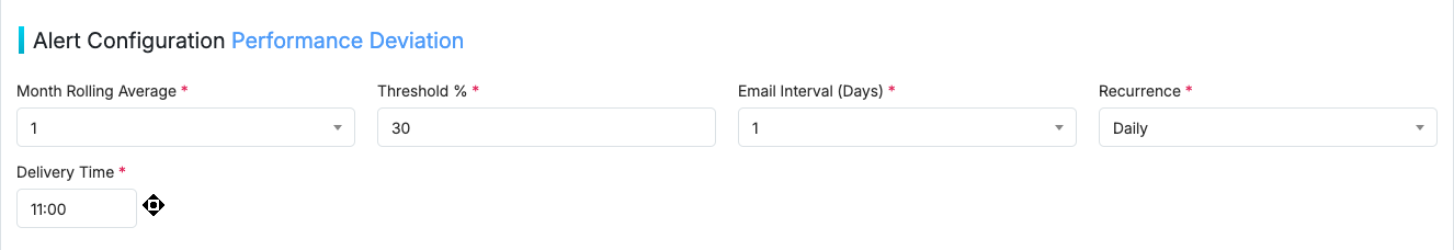When the alert type is selected, as Performance Deviation, the alert configuration is as described below.