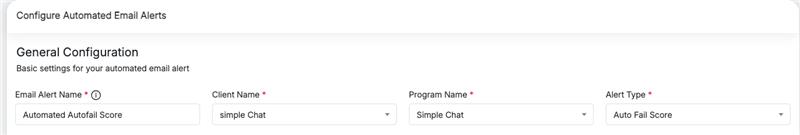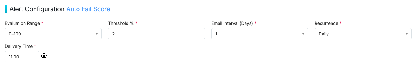 When the alert type is selected, as Auto Fail Score, the alert configuration is as described below.