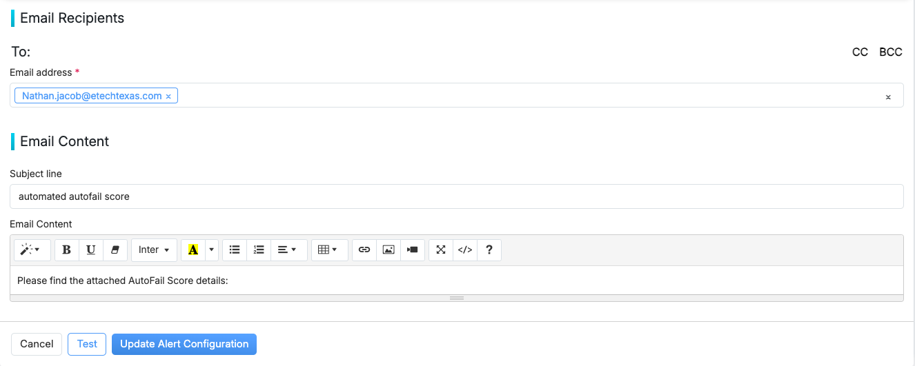 This section provides an example of how to configure and send an Auto Fail Score alert using the Email Alert Configuration feature.