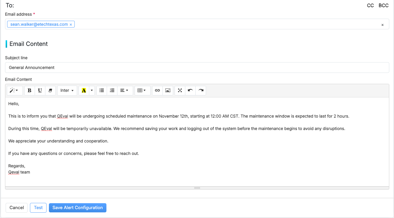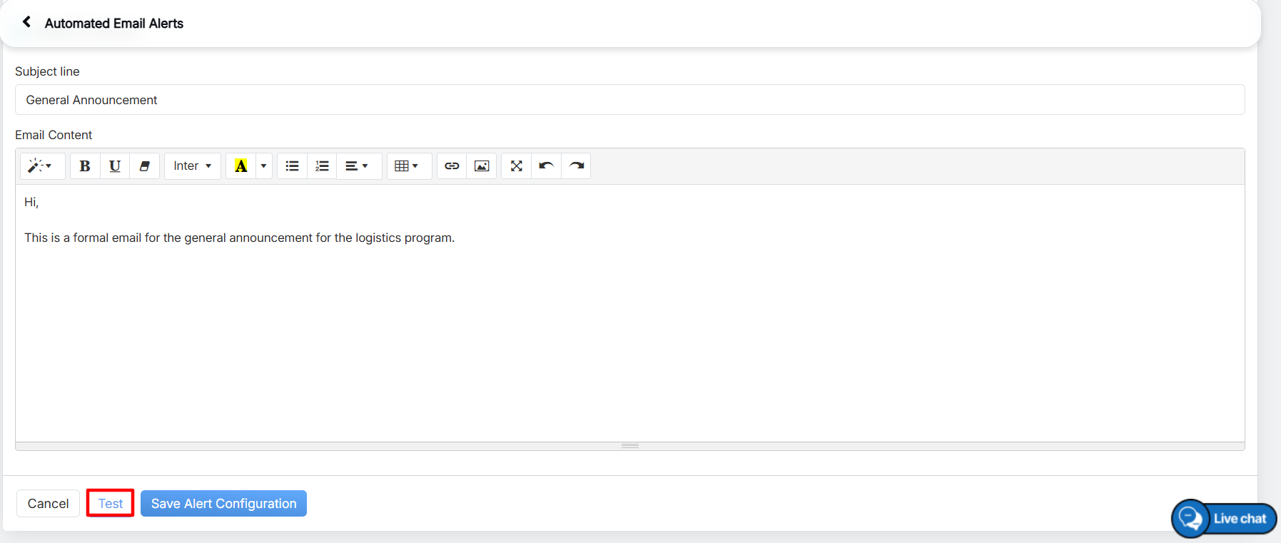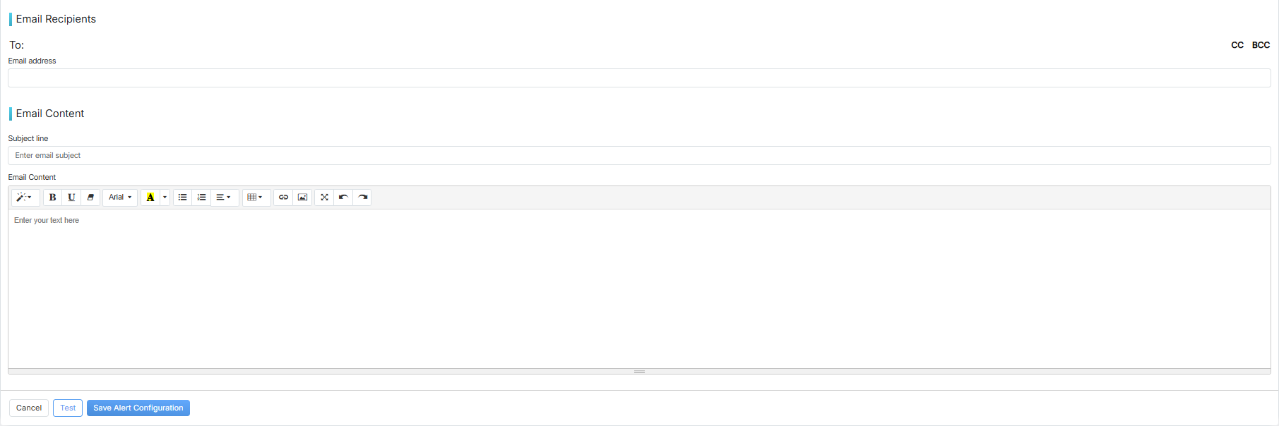Enter the subject line and email content and click on the button Save Alert Configuration.