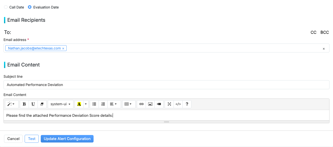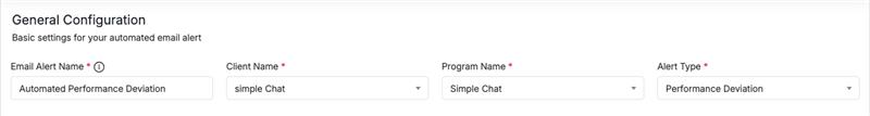 This section provides an example of how to configure and send a Performance Deviation alert using the Email Alert Configuration feature.