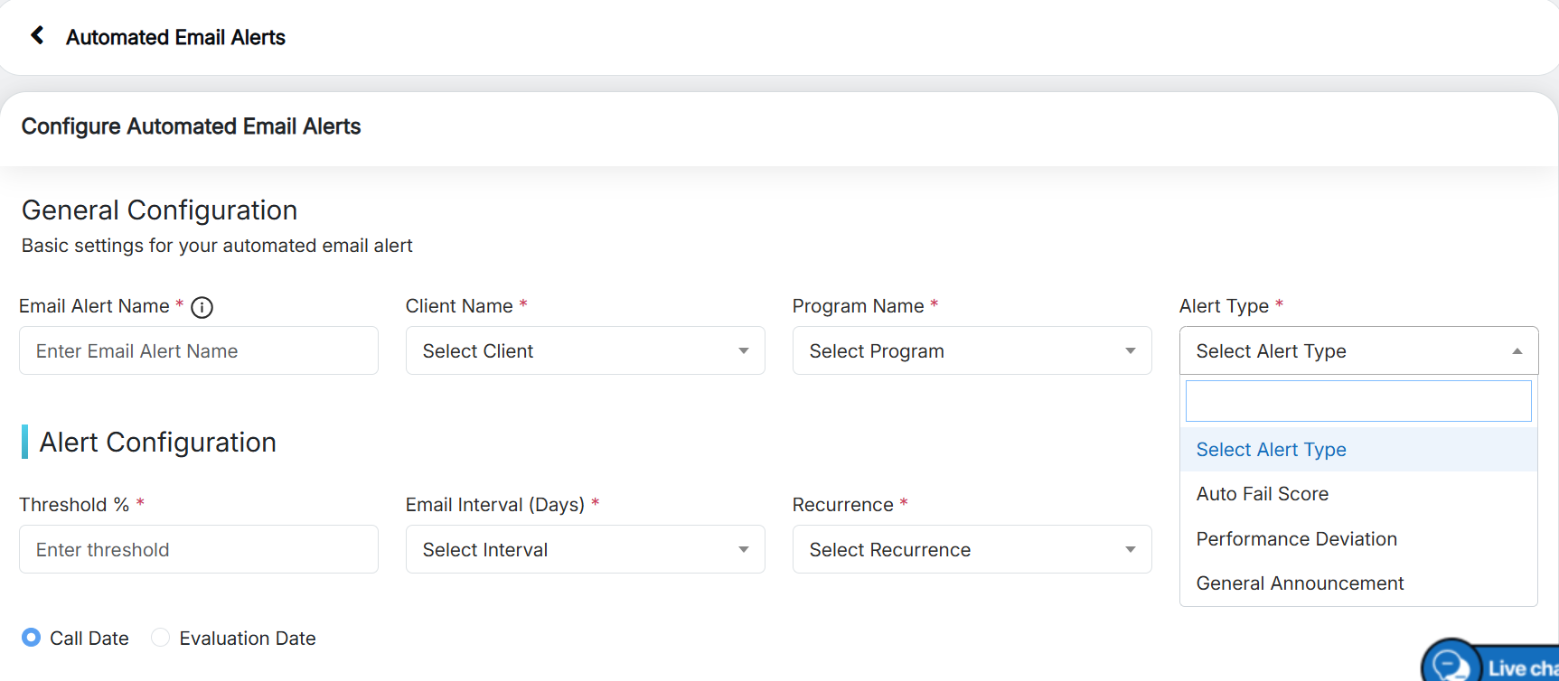 Threshold is an open textbox where the user can set specific percentage for metrics like call quality, compliance. If an agent’s score falls below this threshold, Qeval sends an automated email alert to supervisors or quality analysts.