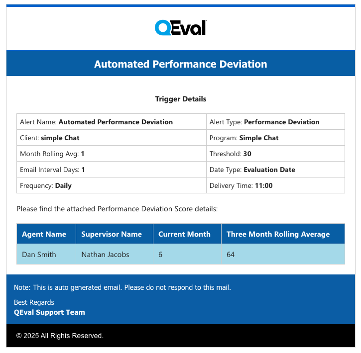 • Performance Deviation – Triggers alerts when performance metrics deviate beyond configured limits, helping supervisors quickly identify and address agent performance gaps.