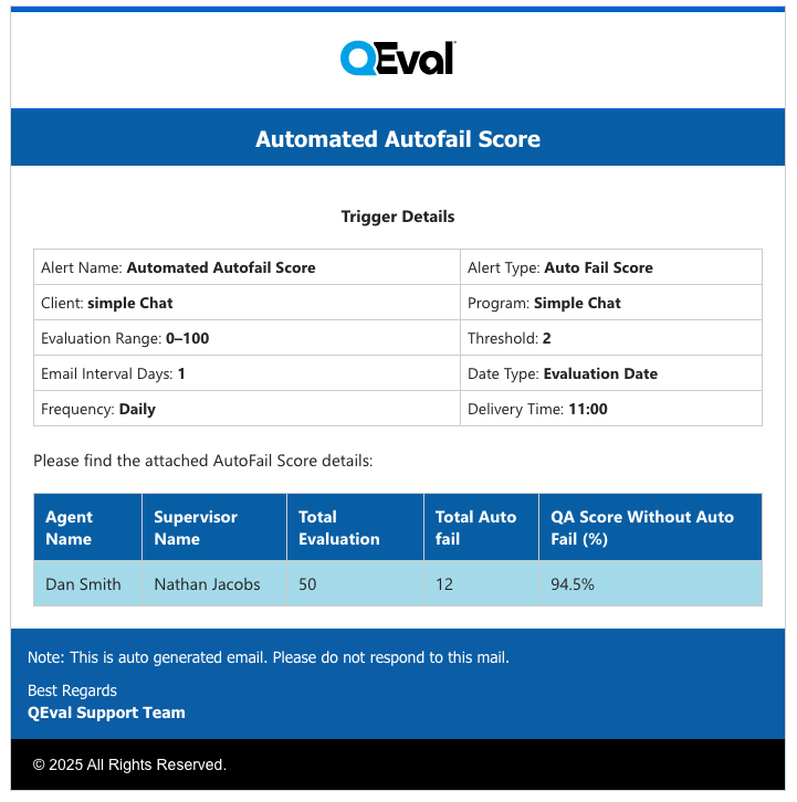 • Auto Failure Score – Automatically notifies stakeholders when agent evaluations exceed defined auto-fail thresholds, ensuring prompt attention to recurring quality issues.