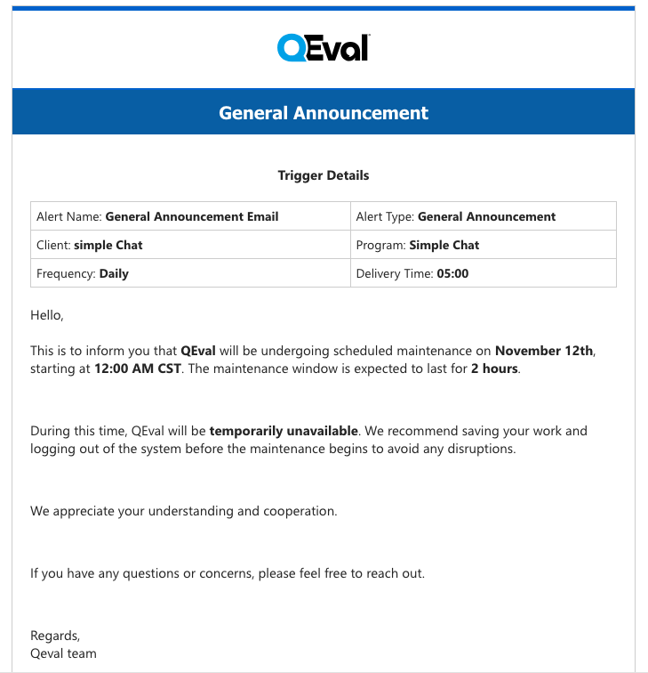 The alert preview displayed here reflects the configuration settings outlined above.Preview of General Announcement