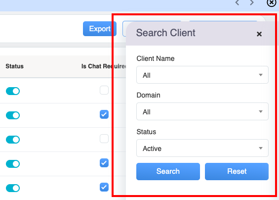Once the necessary search filters are configured, click on the Search button to search the active client details, or click on the Reset button to reset the search filters.