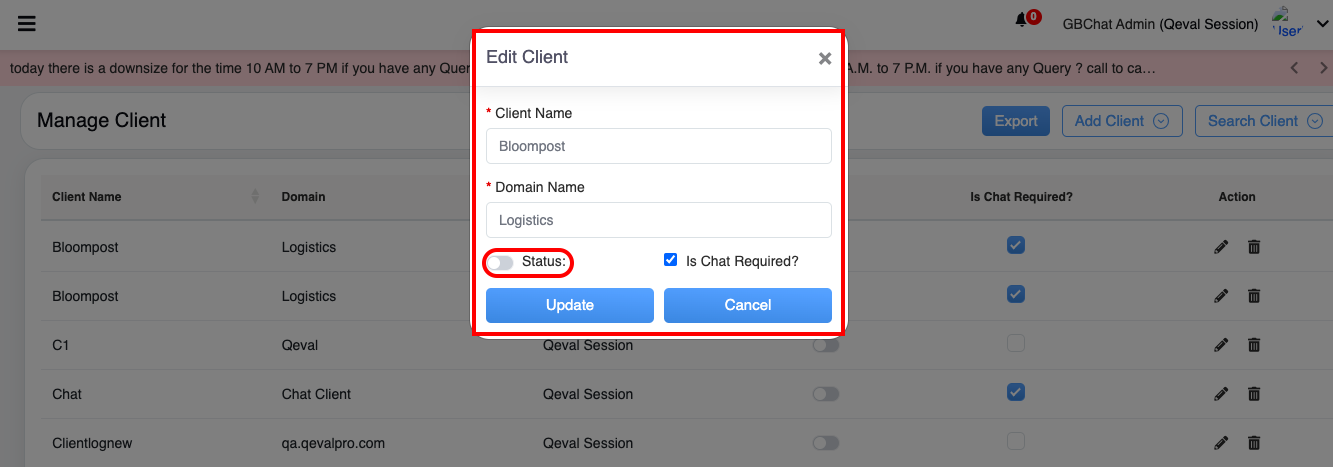 toggle button displayed under the Status column. An acknowledgment message will be displayed, and the selected client status will be changed to inactive.