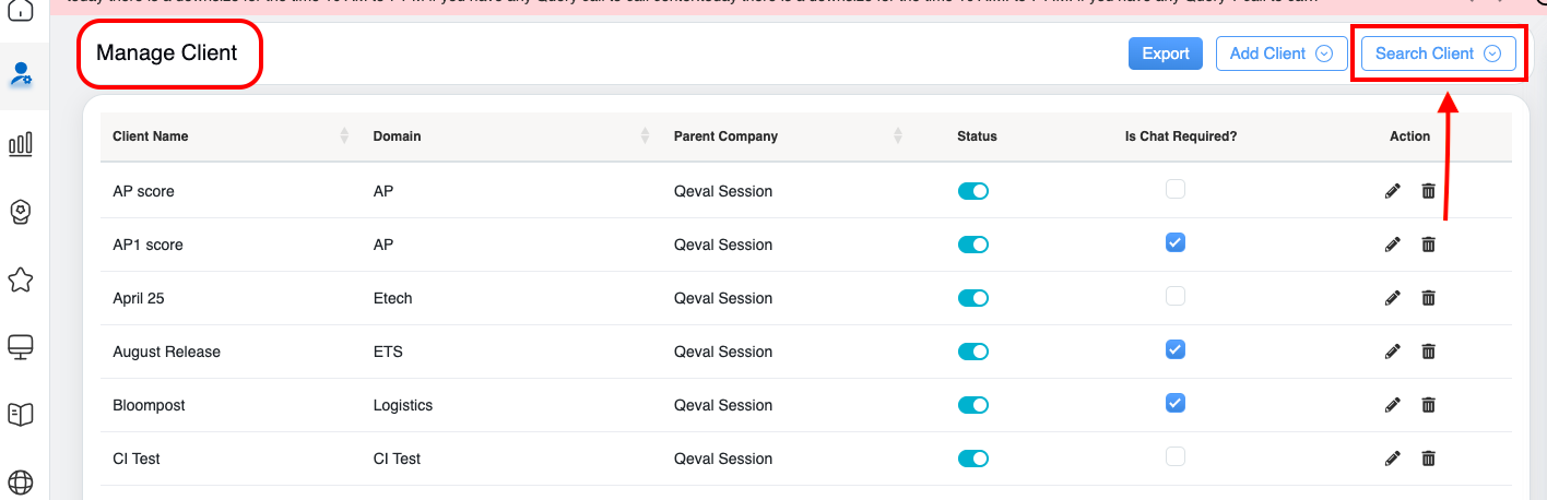 A Search Client features helps the logged-in user to search active or inactive client details added in the QEval system.