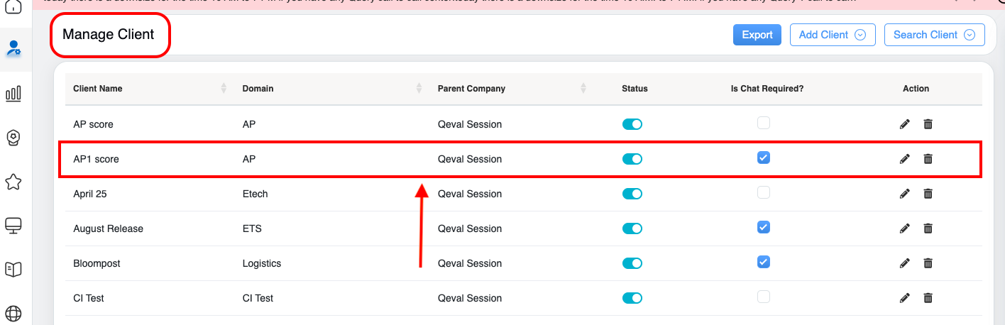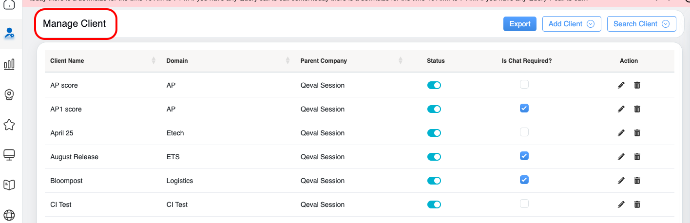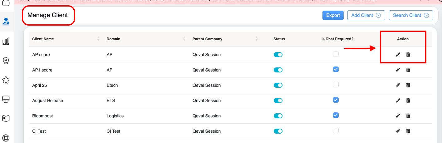 On the Manage Client page, the authorized user can delete the specific client details from the QEval system.