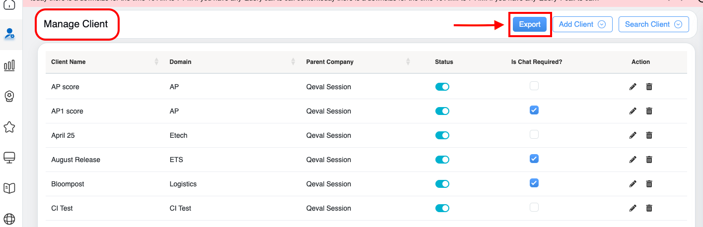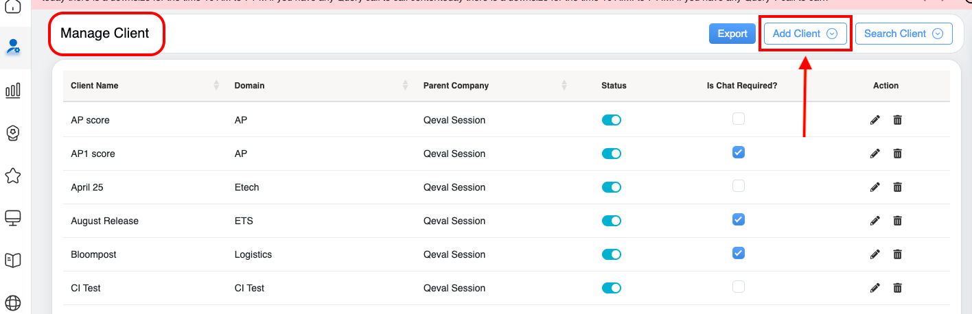 The authorized user can add a new client and the associated domain within the QEval System. To add the new client details, click on the Add Client button displayed on the Manage Client page as highlighted in the screen below: