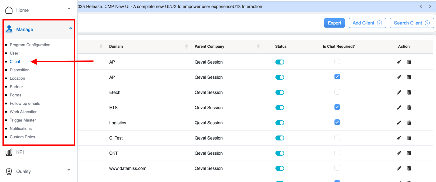 On the Manage Client page, the logged-in user will be able to access the mentioned below functionalities: