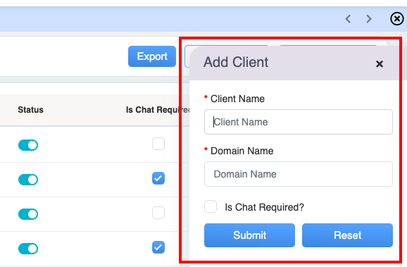 Enter the name of the client and name of the domain in the textboxes displayed under Client Name and Domain Name respectively. Once the necessary fields are configured, click on the Submit button to add a new client detail. Click on the Reset button to reset the fields or click on the Cross