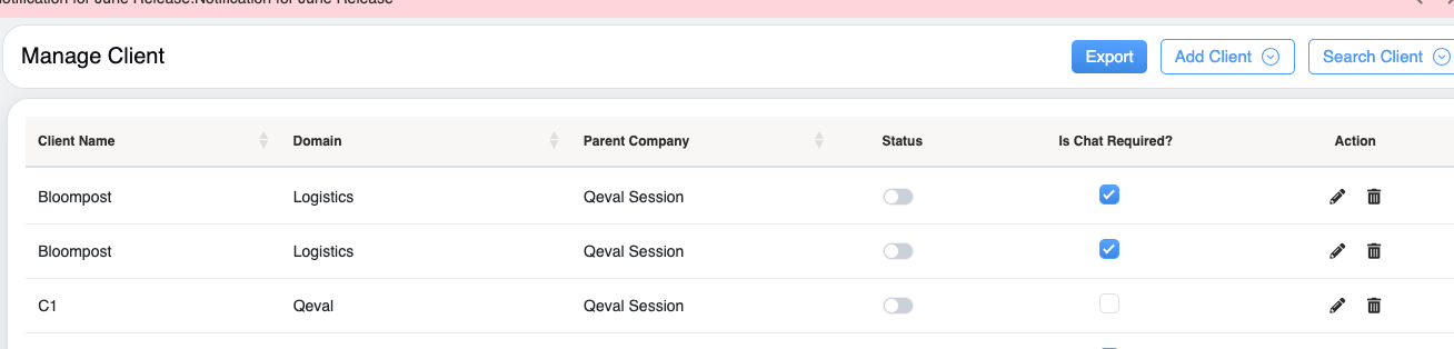 - Deleting a client will result in the permanent removal of the specific client details from the QEval system, making it impossible for the user to fetch or recover the deleted details.