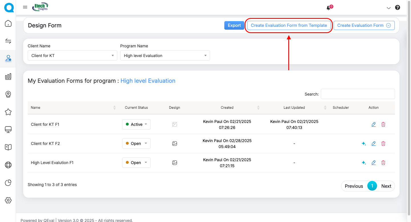 The Create Evaluation Form from Template button is available at the top right of the Design Form page.