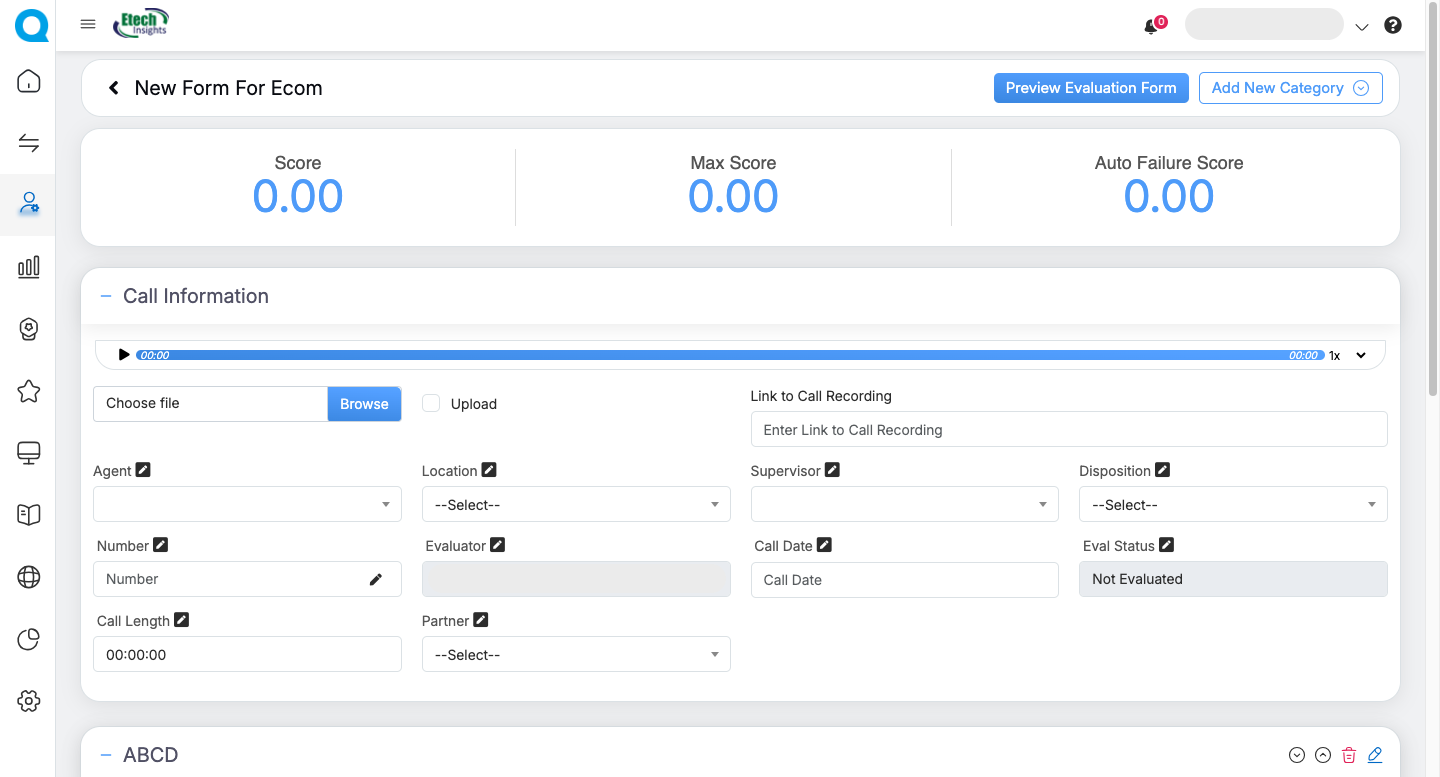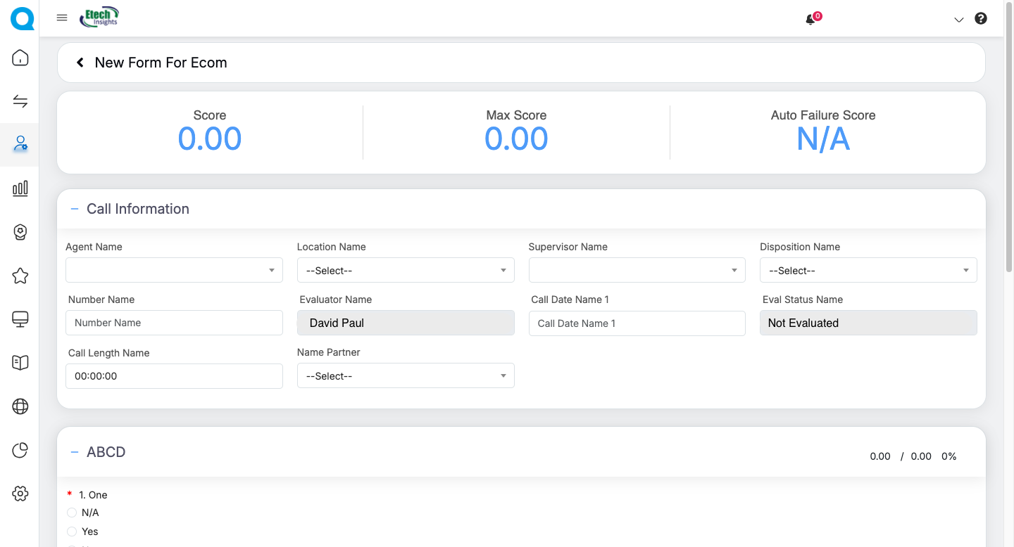 QEval enables administrators to create, customize, and manage evaluation forms used by QA teams to assess agent performance during customer interactions. From the Design Form page, users can create, edit, delete, activate, deactivate, schedule, preview, or view the design details of any form.