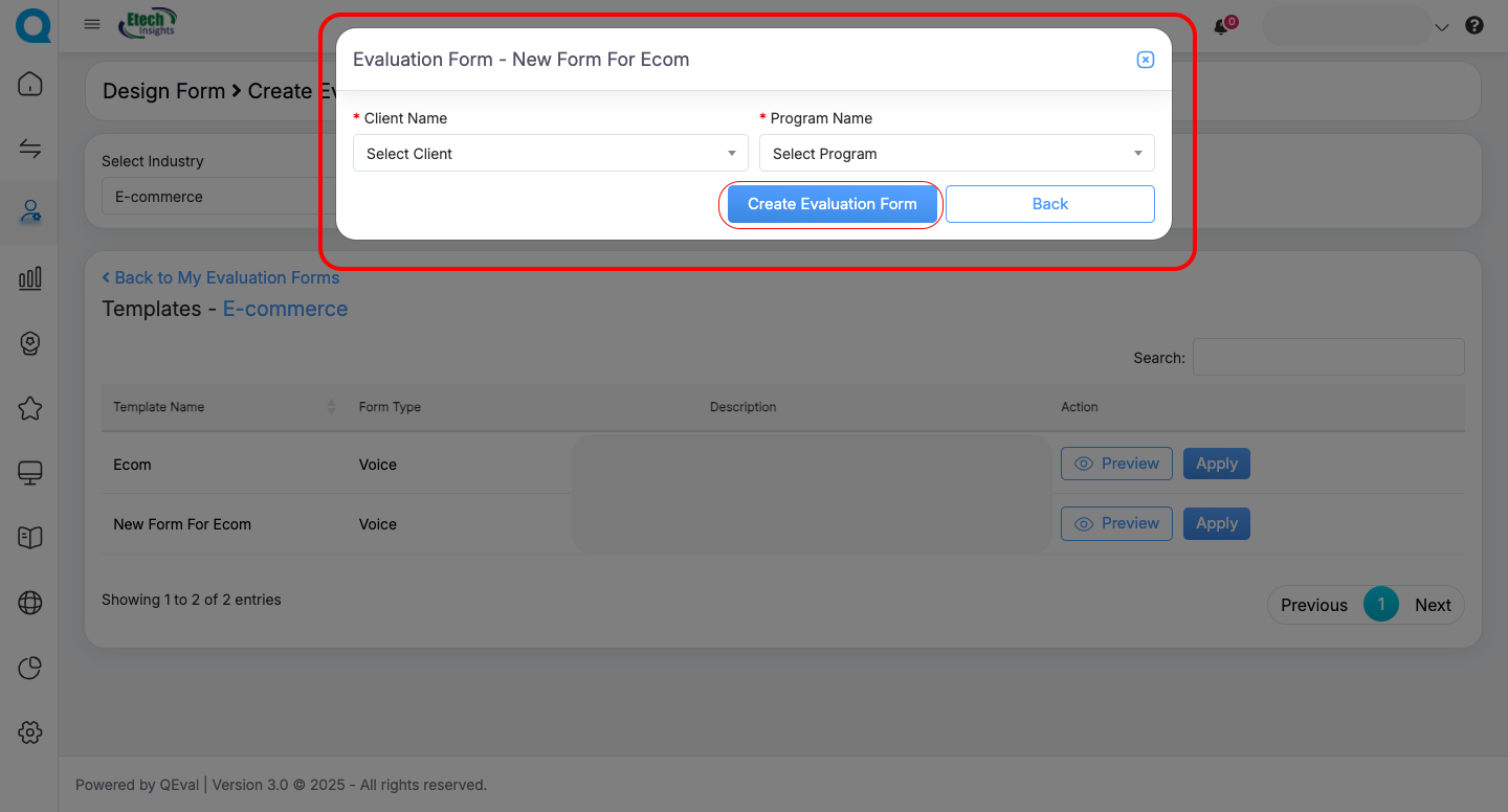 After you click Apply, a popup will appear where you can simply select the Client and Program, then click Create Evaluation Form.