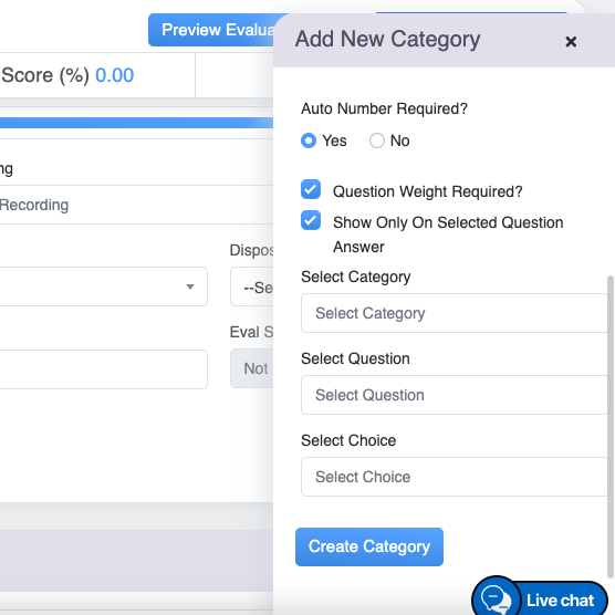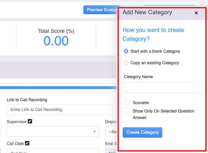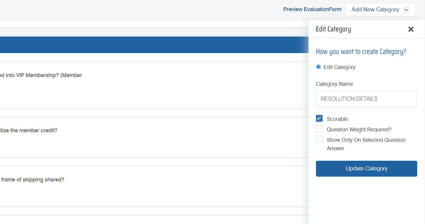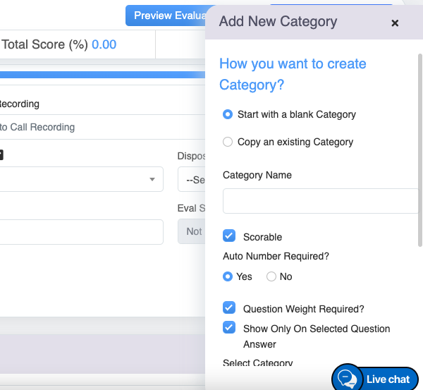 Selecting to create a category using Start with a blank category provides an option to the user for creating an entirely new category within the form. The user will also get the option to provide a category name, keep it score-based, and assign a weight to the question.