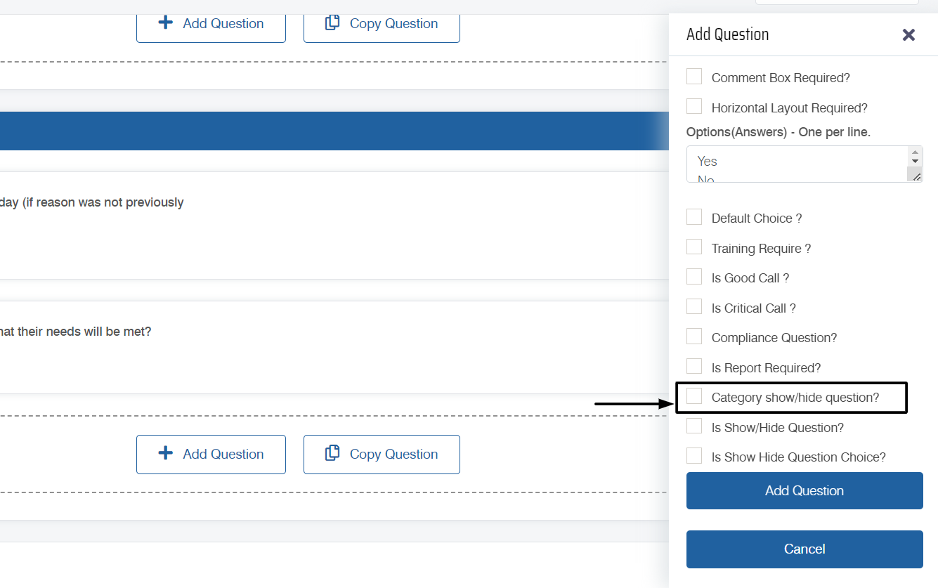 The above screen shows the created category with the Scorable option checked. However, a show hide category question can also be created without selecting the Scorable option.