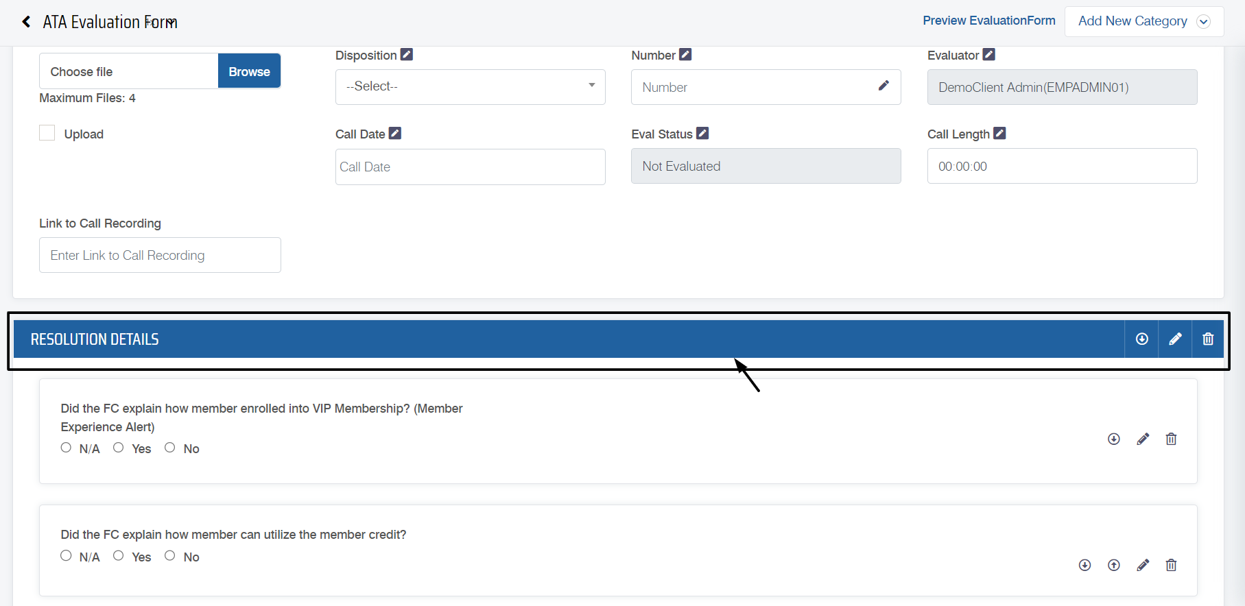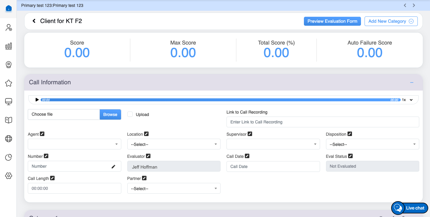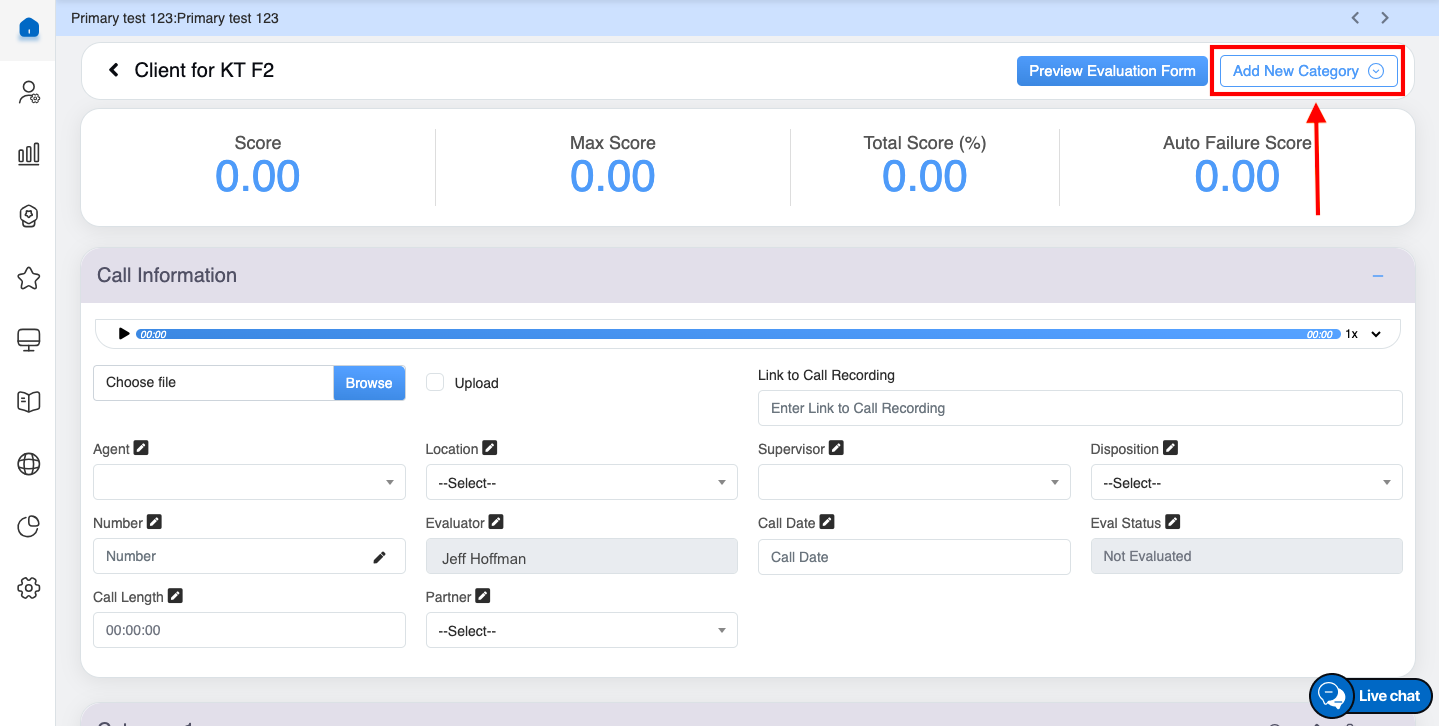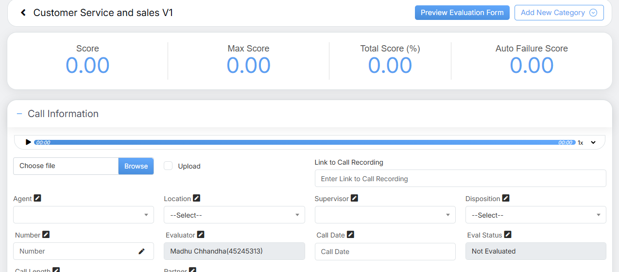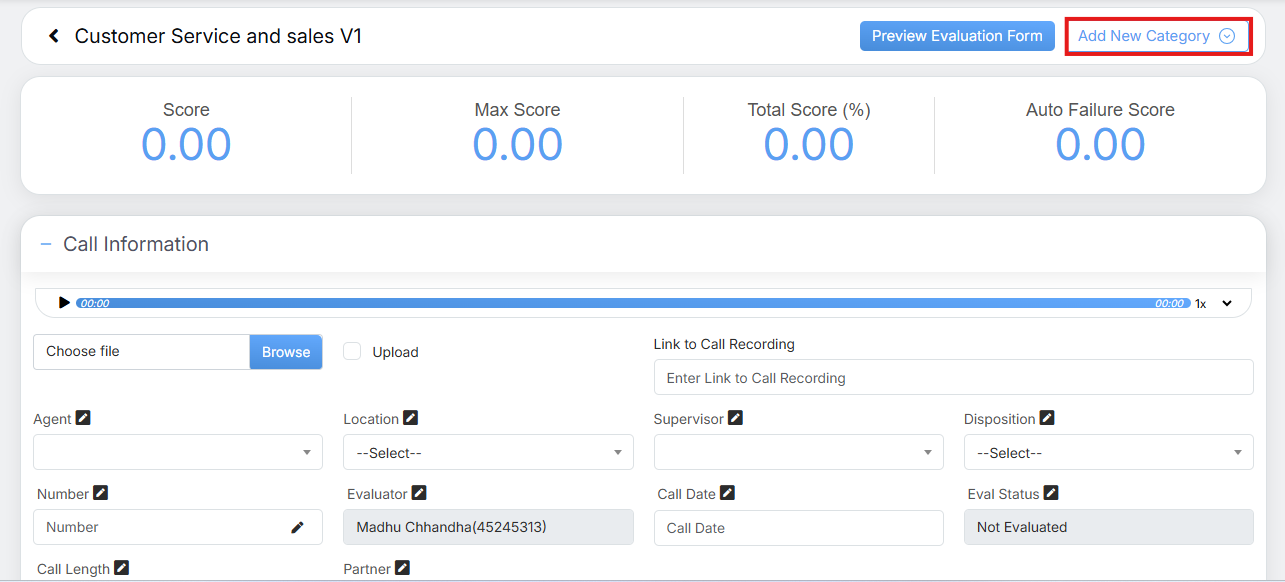 - Default Category: The page displays a default category Call Information or Chat Information based on the type of form, the user has selected while creating the Evaluation form with some basic information as below: