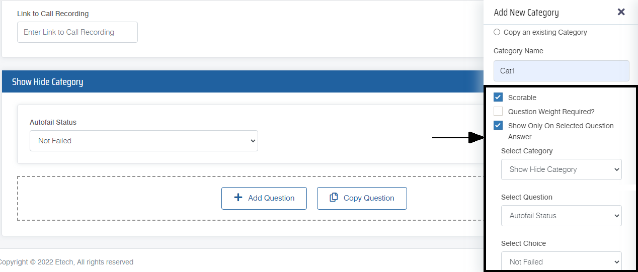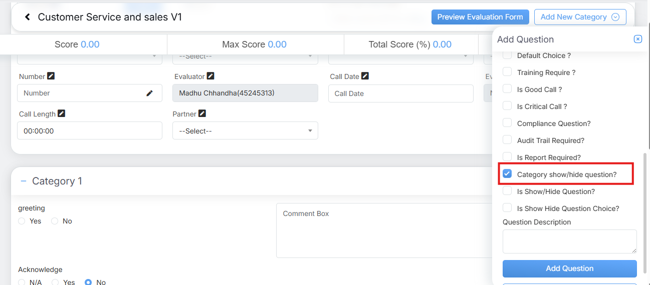 This feature helps to show or hide a particular category upon selection in an evaluation form.