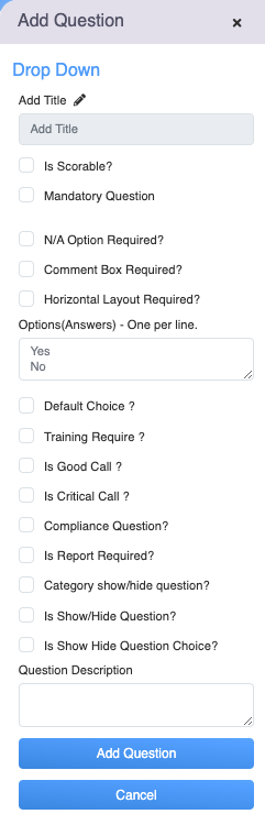 7. Dropdown: Select if a dropdown list is required in the form. By default, this question is a scorable question. On selecting this one can also set its properties.