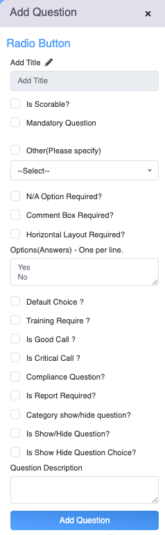 • Compliance Question?: Select if the question is to be made of type compliance. Reporting is done based on this option.