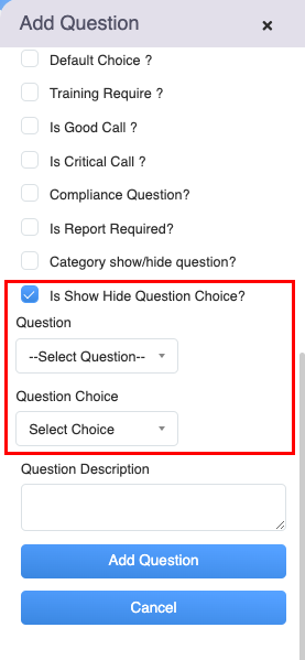 9. Configure the details of the question, then select the Is Show Hide Question Choice option followed by selecting the question and choice of question to show or to hide and click on Add Question button from the list of options from the Add Question screen as shown below: