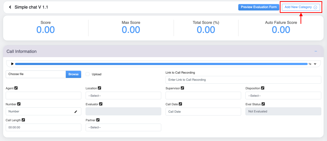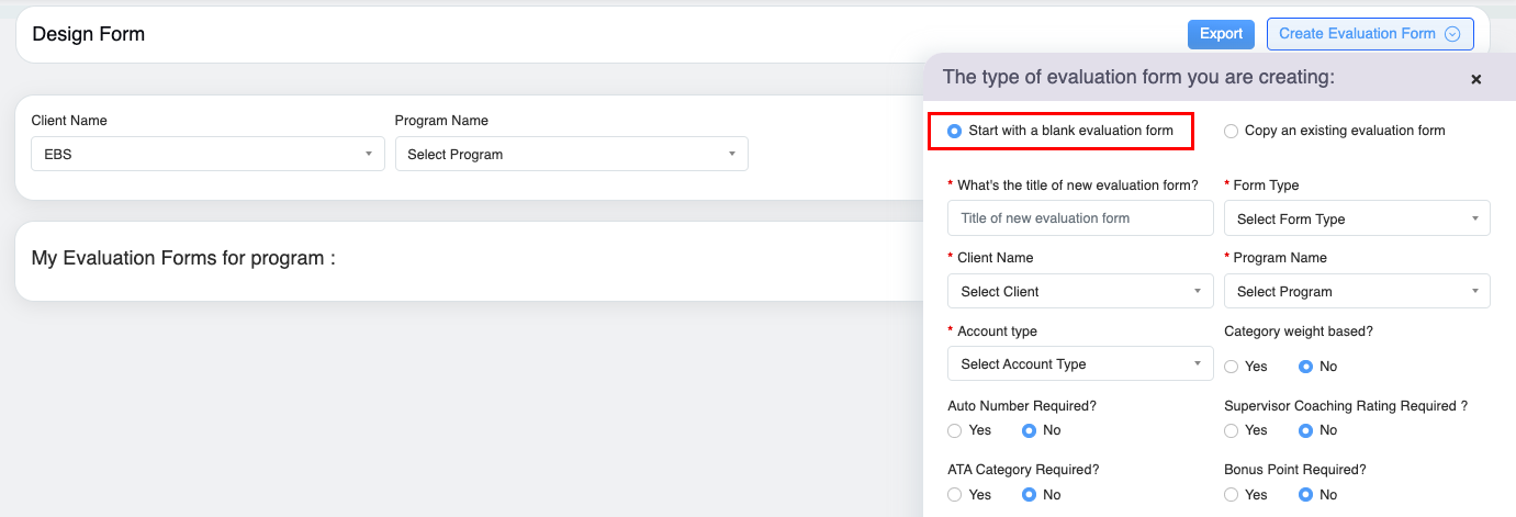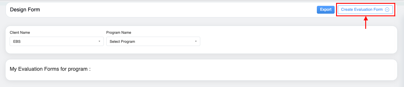 1. On the Design Form page, click on the Create Evaluation Form button as shown on the screen: