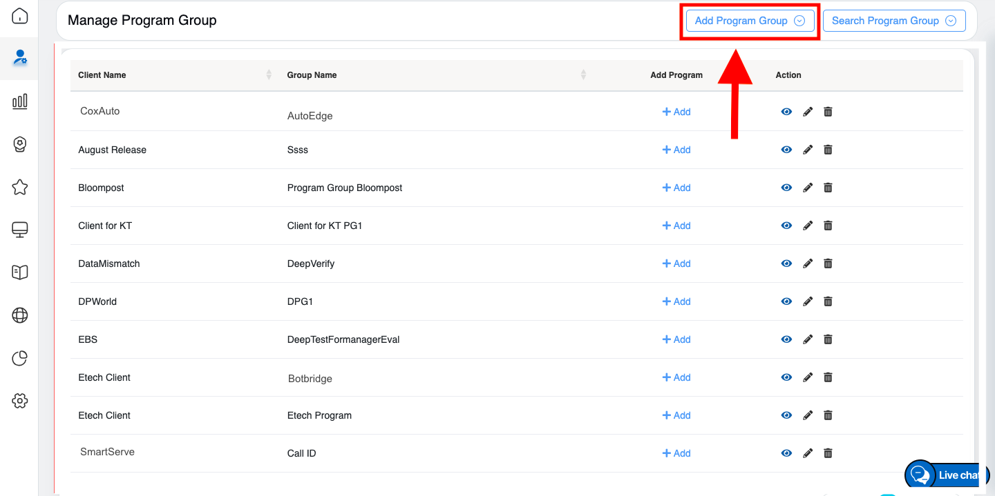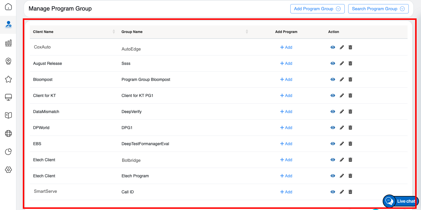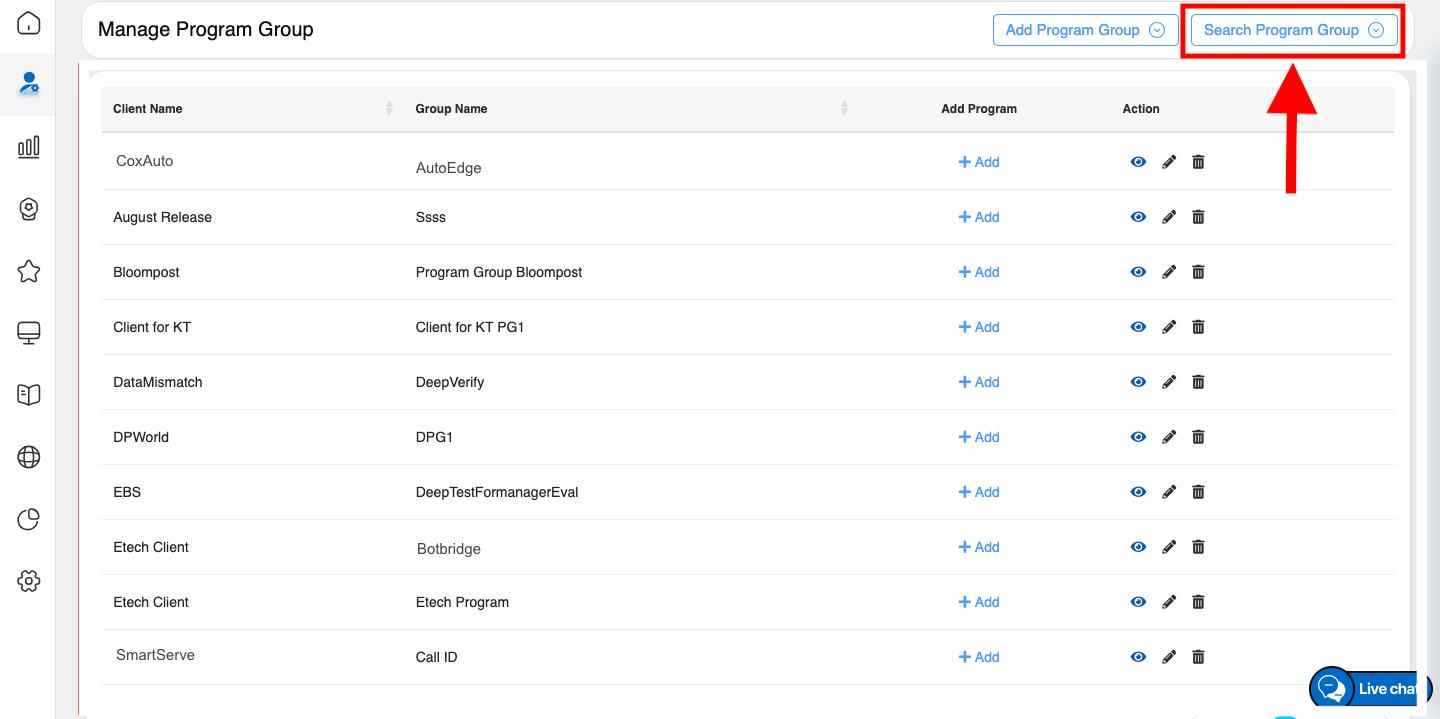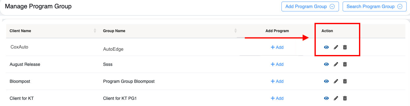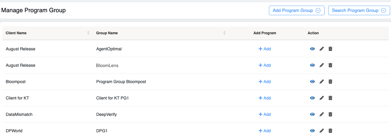 Based on the applied search filter, all the program groups will be displayed on the Manage Program Group page as shown on the screen below: