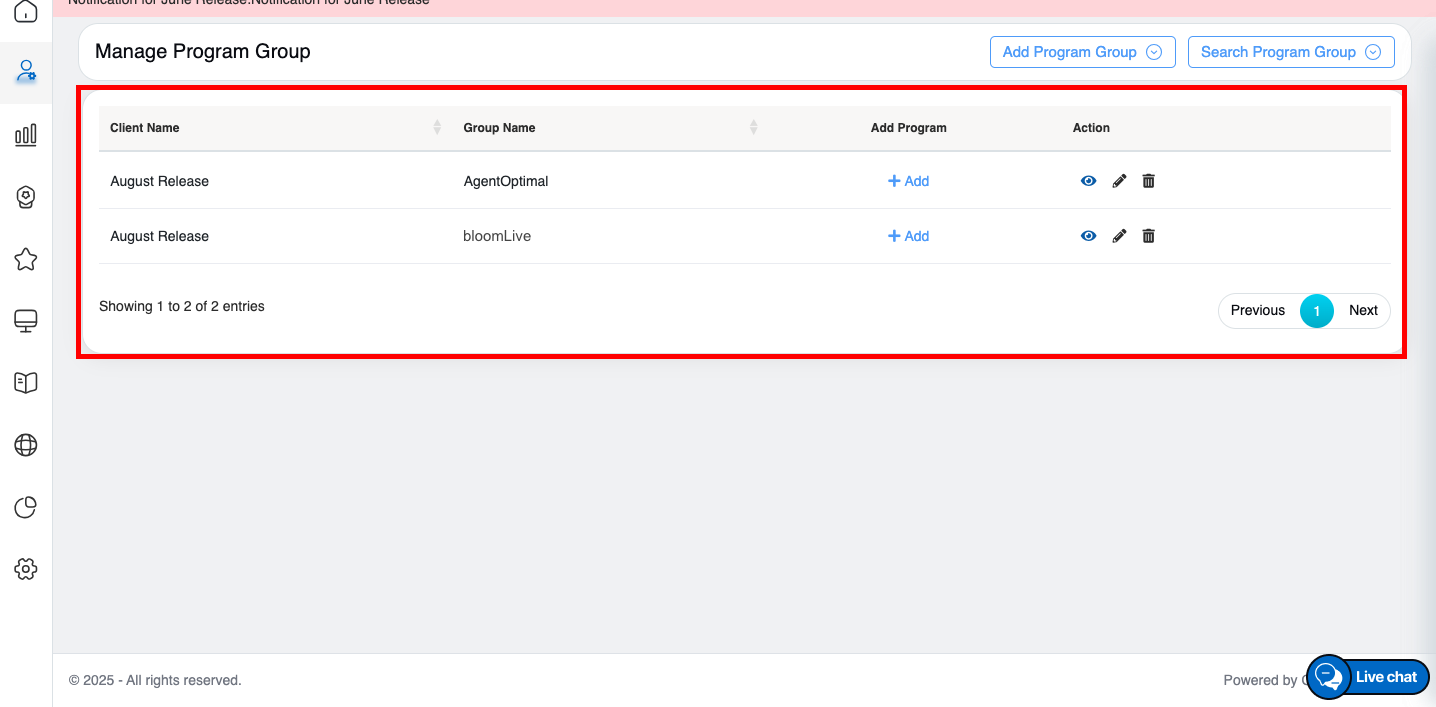The newly added groups will be displayed on the Manage Program Group page as displayed on the following screen: