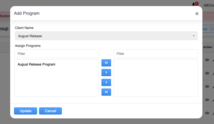 • Assign Programs: Select the required program(s) from the left-hand side box which will display the list of all the programs created for the selected Client.